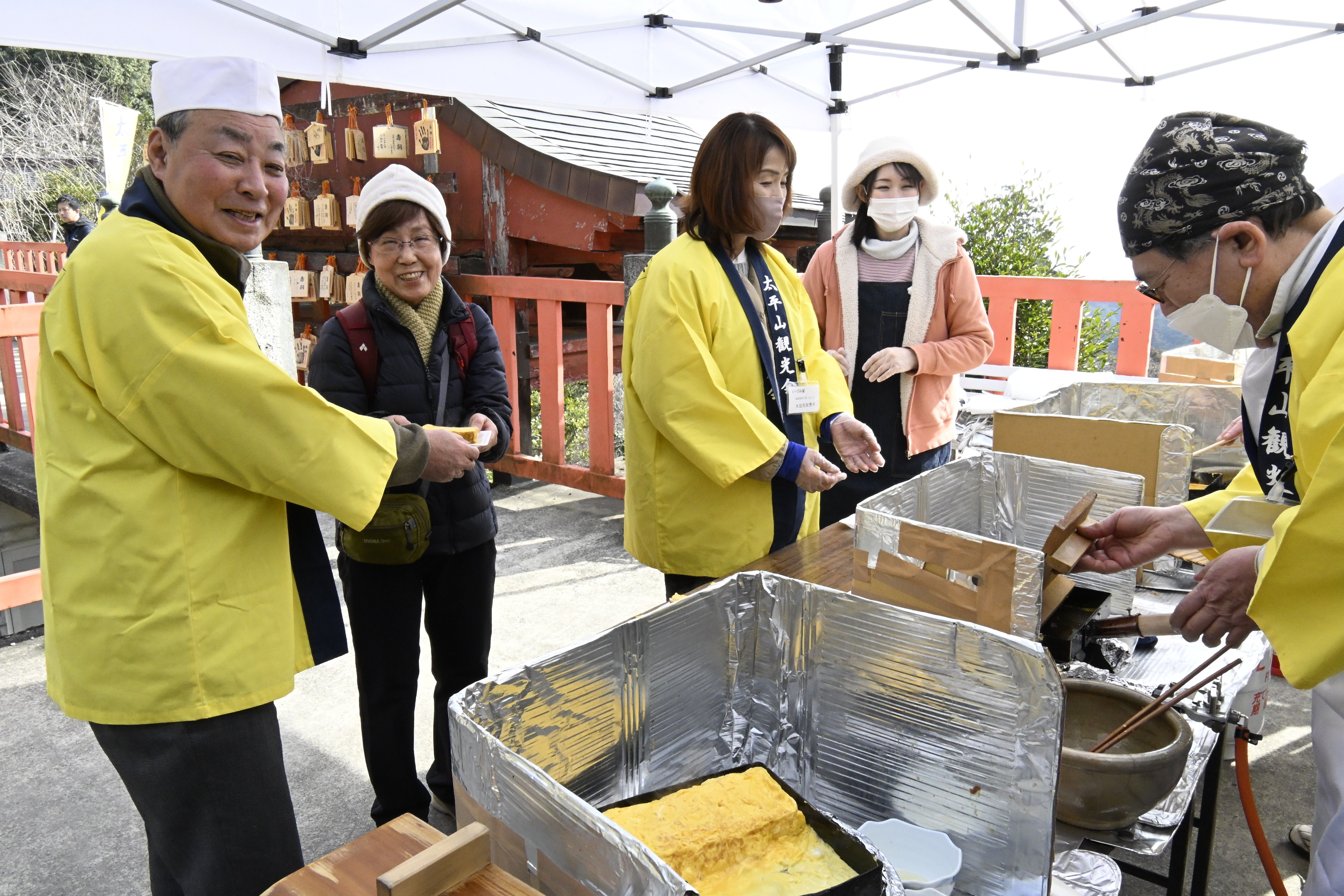 市民らに卵焼きを振る舞う太平山観光会のメンバー