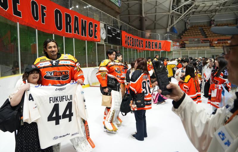 リンクで選手と交流するファンたち=日光霧降アイスアリーナ