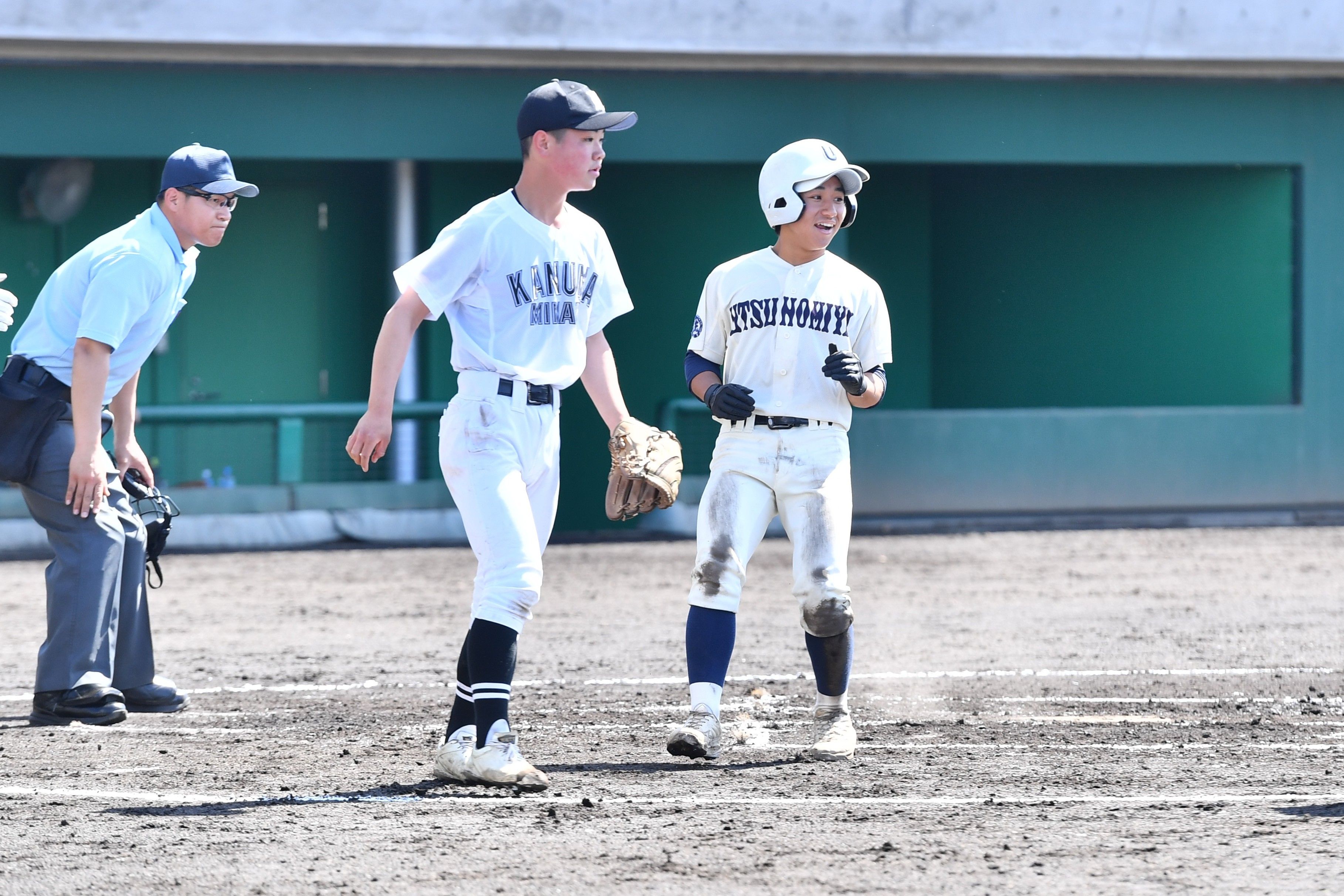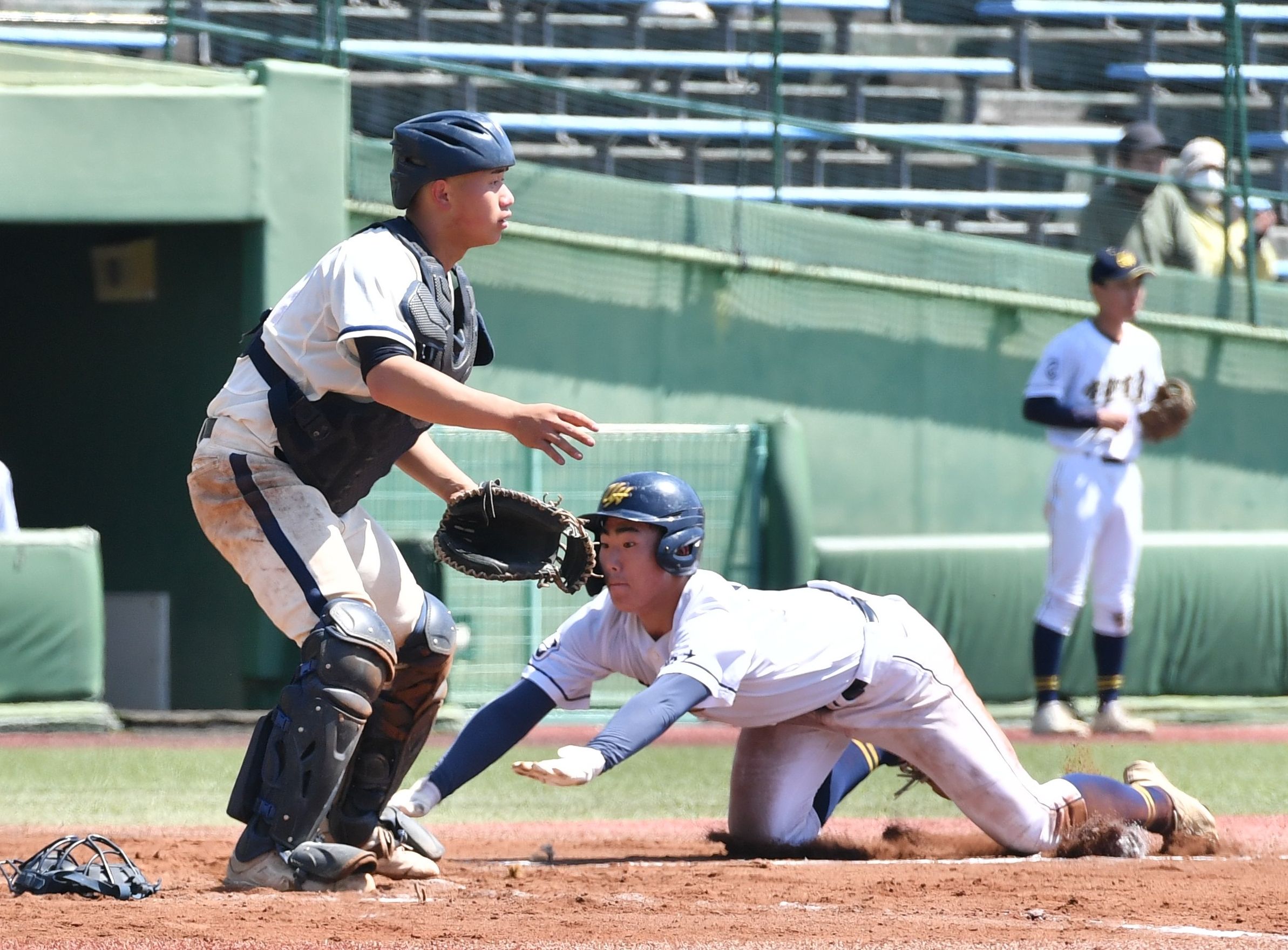 7回、宇東の菅谷(右)が阿見の左前適時打で生還=清原球場、井上孝男撮影