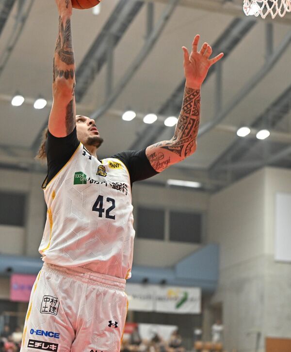 後半、ブレックスのフォトゥがシュートを放つ=富山県西部体育センター