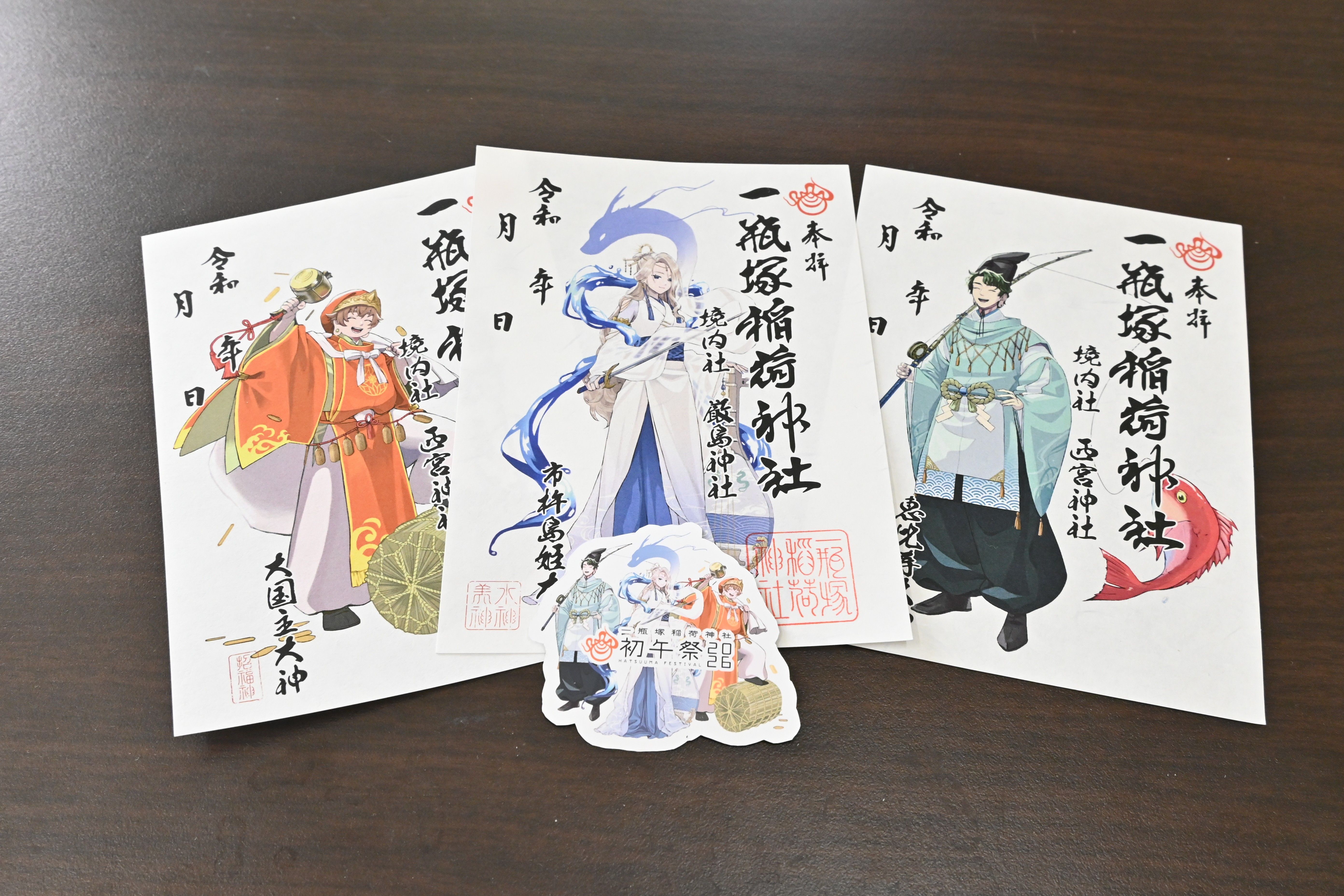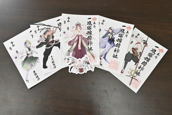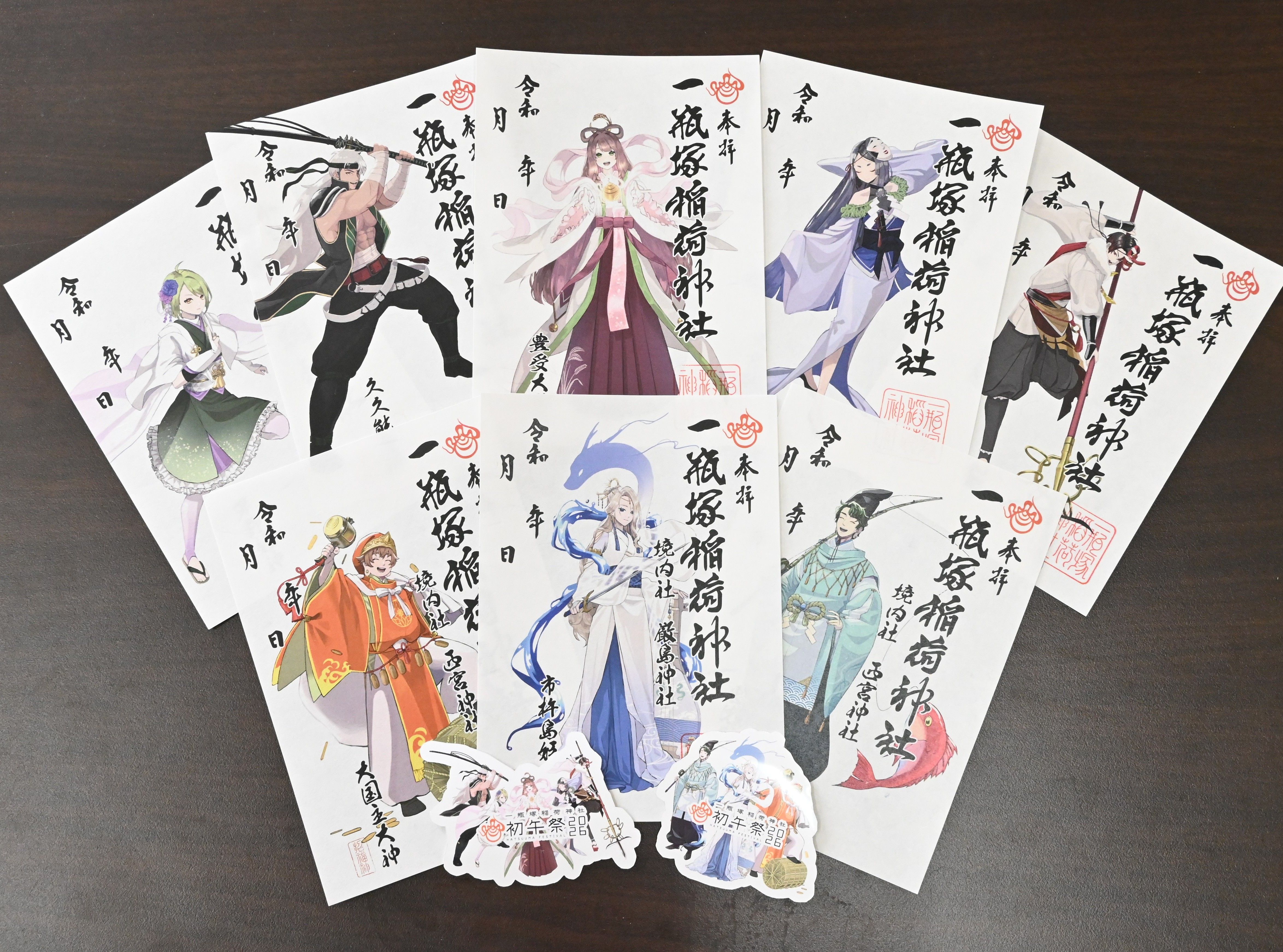 新たに登場した3体の御朱印(下3枚)とポーズ違いの五祭神。そろえると特典ステッカーがもらえる