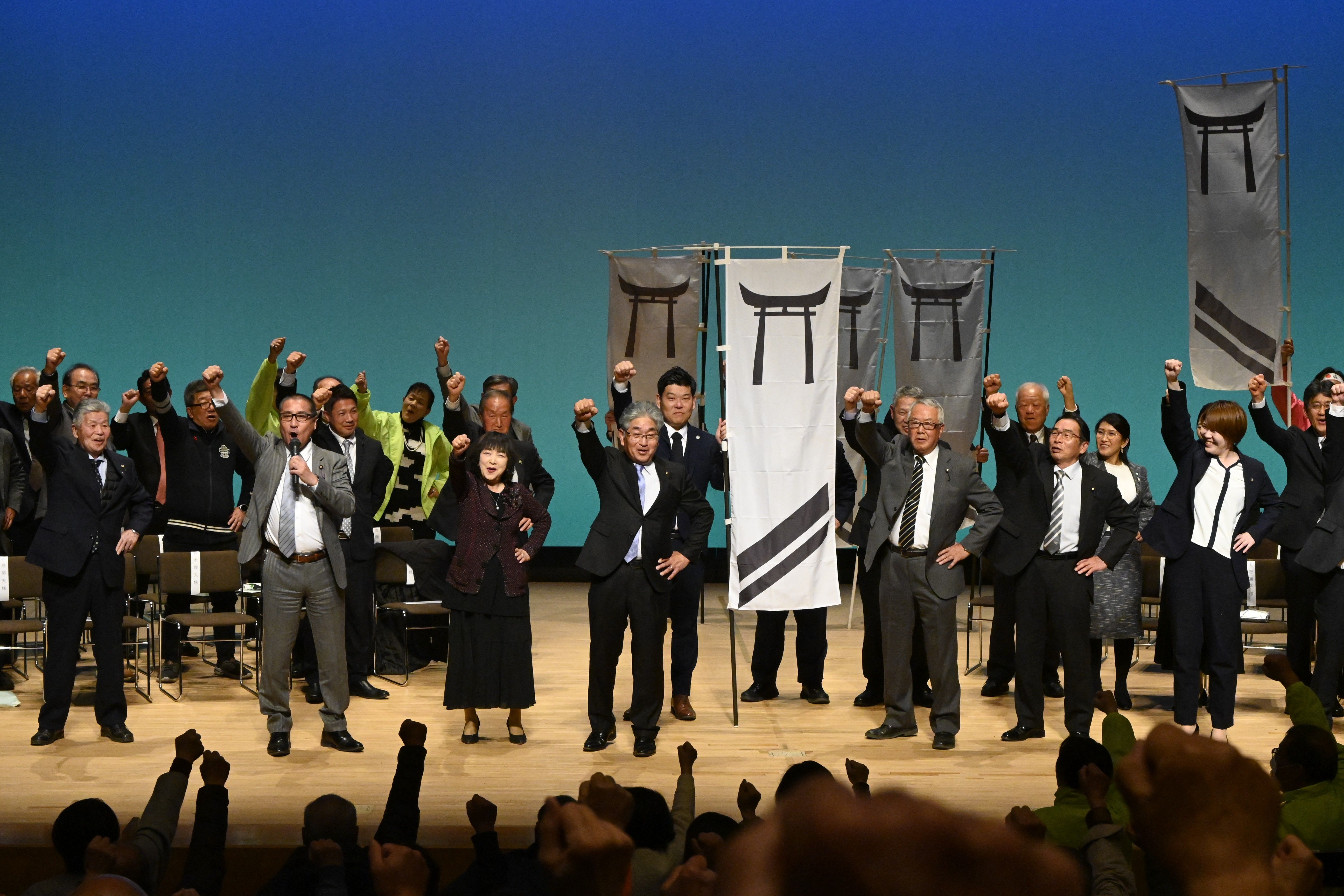 壬生町長選の総決起大会で気勢を上げる小菅後援会の関係者=7日夜、壬生町壬生中央公民館