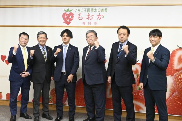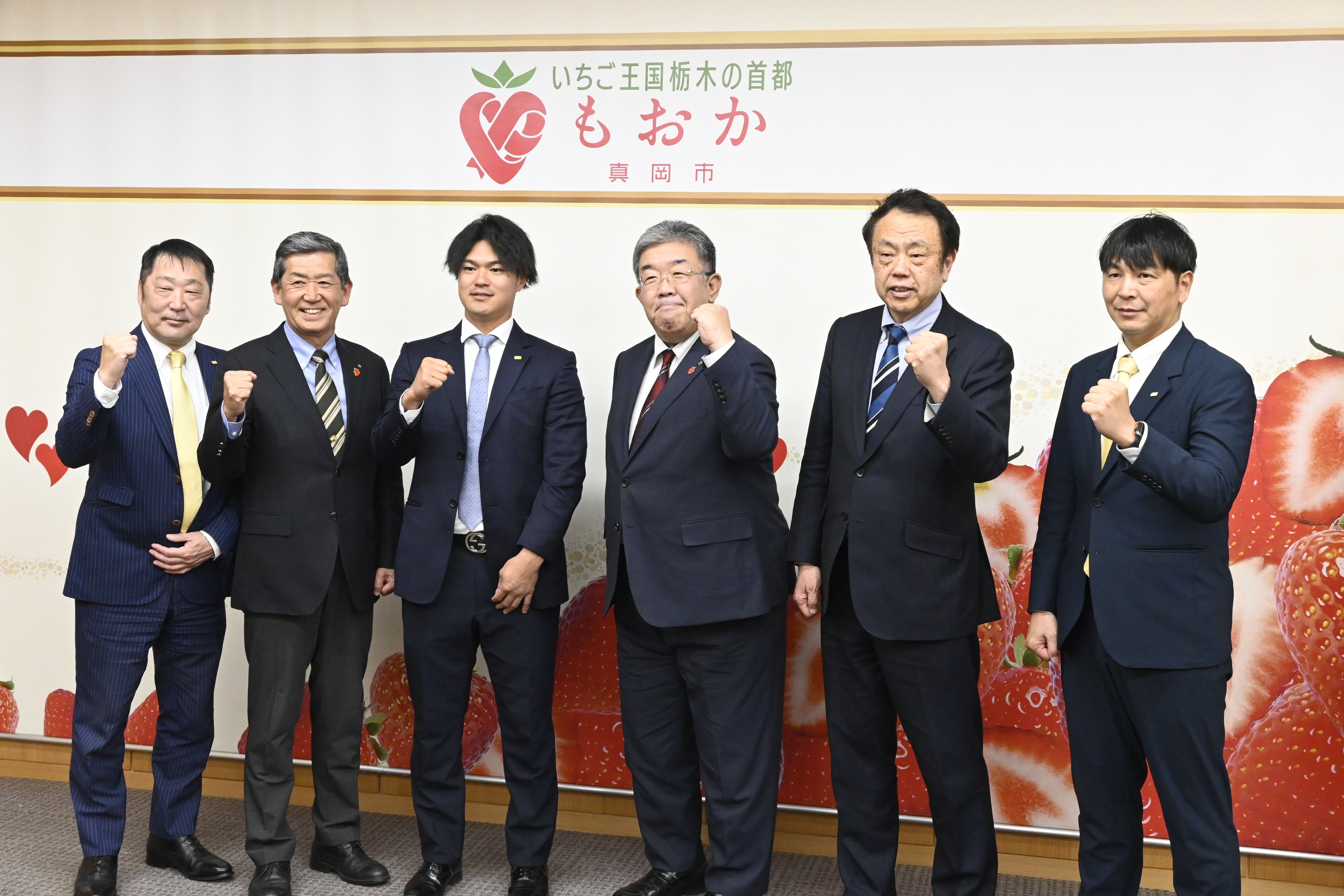 今季開幕を前に中村市長(右から3人目)を表敬訪問した栃木GBの藪下代表(同2人目)ら