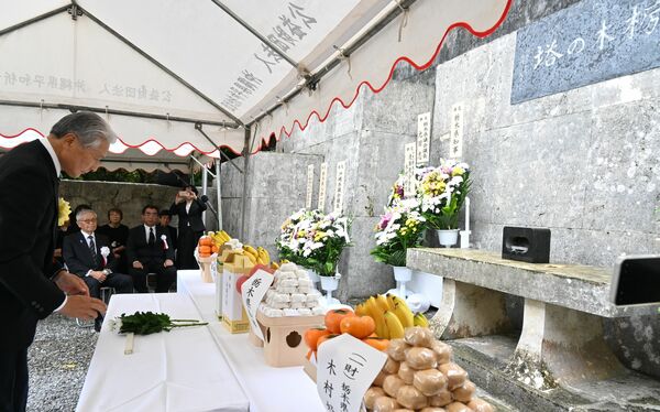「栃木の塔」の前に設けられた祭壇に献花する福田知事(左)=10日午前、沖縄県糸満市摩文仁