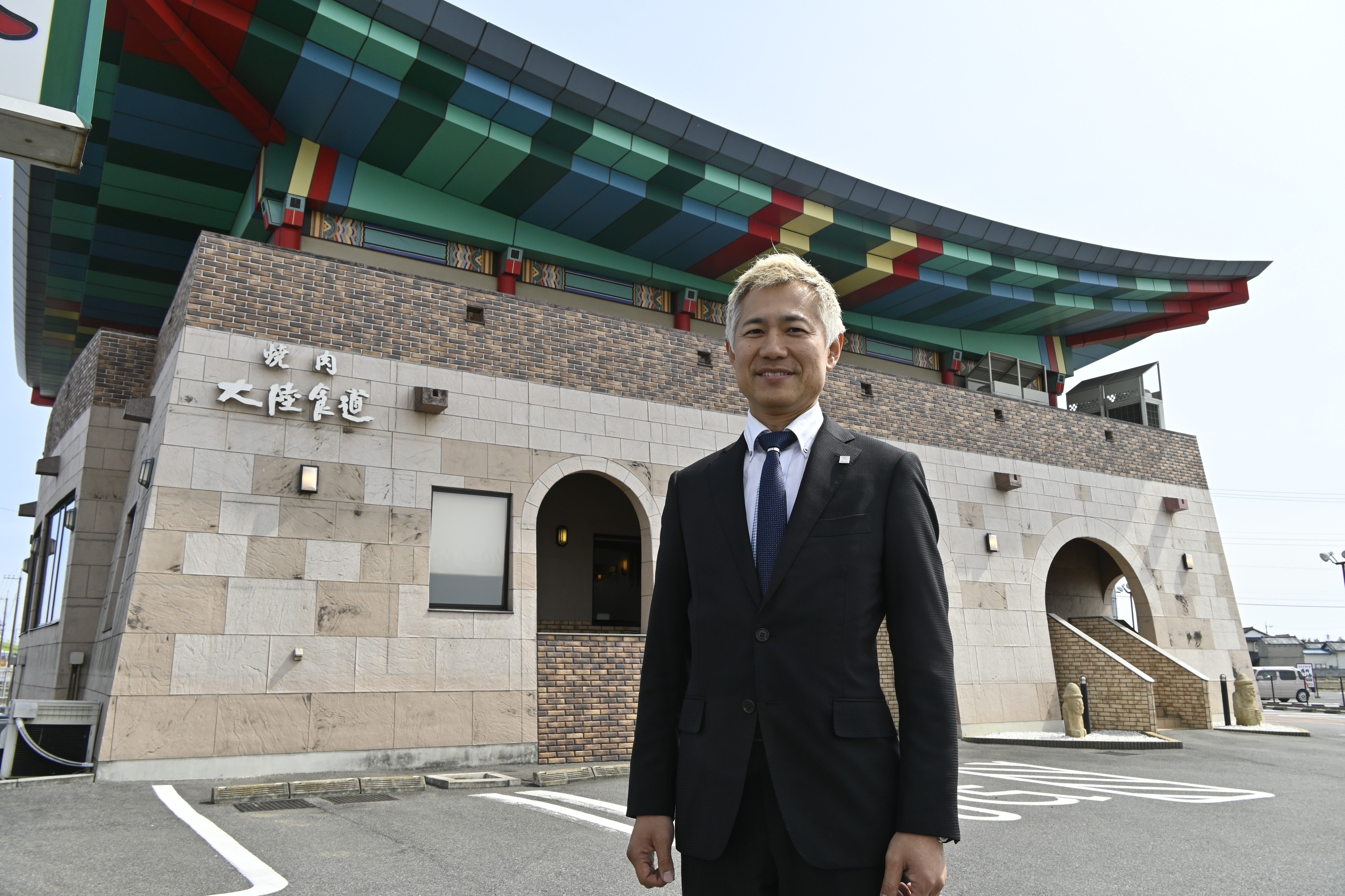 国道50号沿いに立地する小山店の前に立つ廉社長=小山市