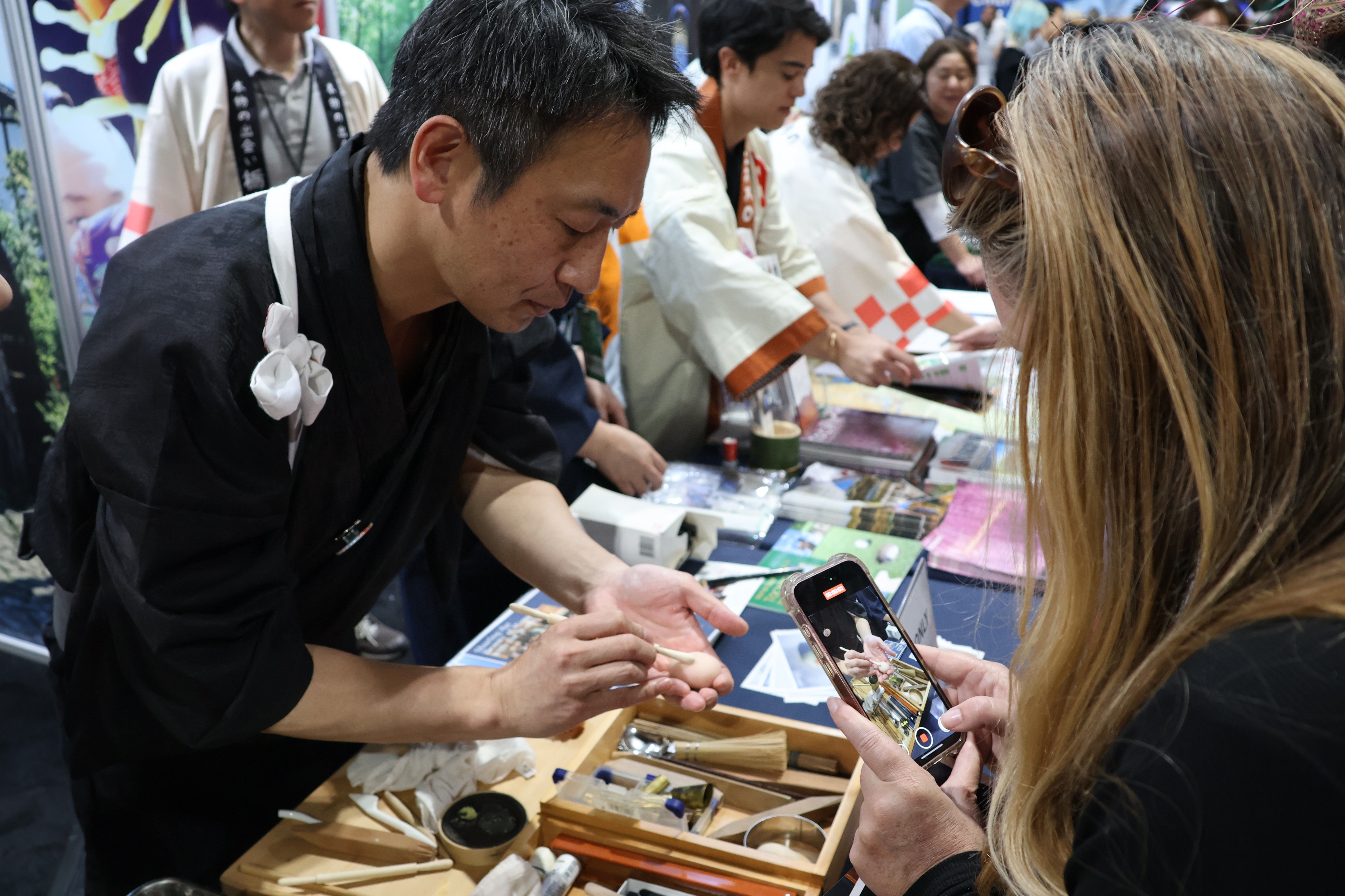 米国の旅行博で練り切りの実演を行う和氣社長=3月上旬