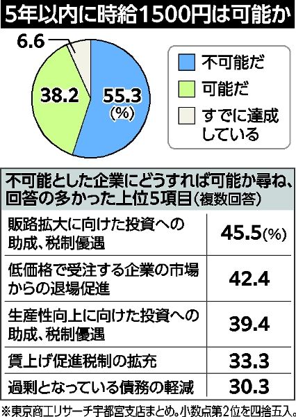 政府目標の最低賃金1500円、栃木県内企業55%が5年以内「不可能」 全国比6ポイント高く 収益圧迫も懸念