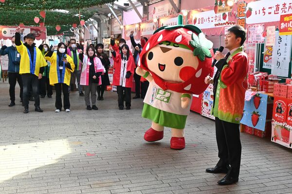 各県自慢のイチゴを販売する「全国いちご会議」のブース=21日午前、横浜市中区