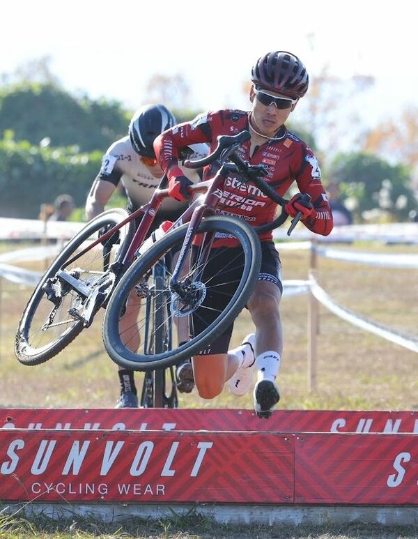 自転車を持ち上げて障害物を越えるブリッツェンの沢田=滋賀県草津市の烏丸半島特設コース