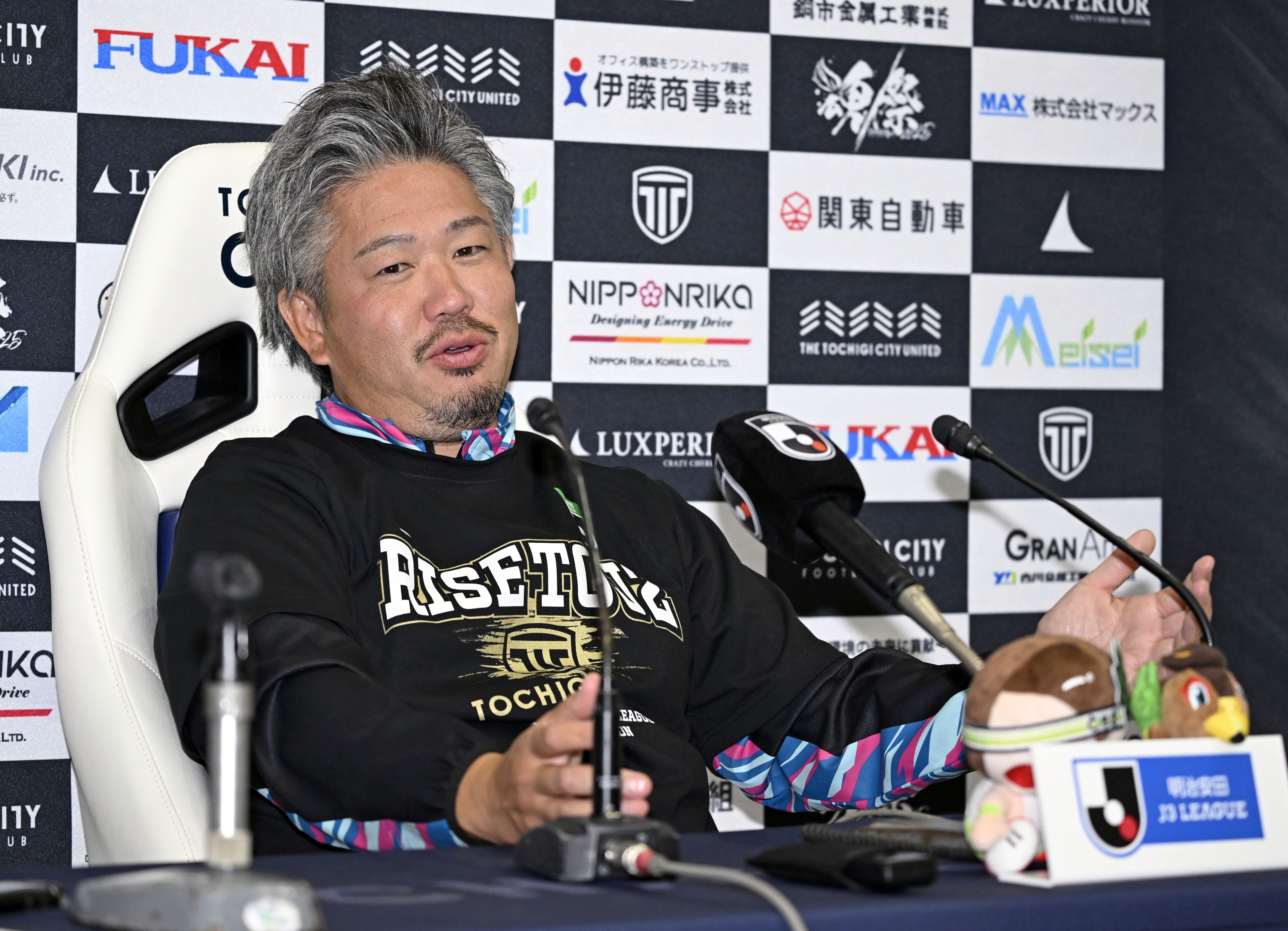試合後、会見する栃木シティの大栗社長