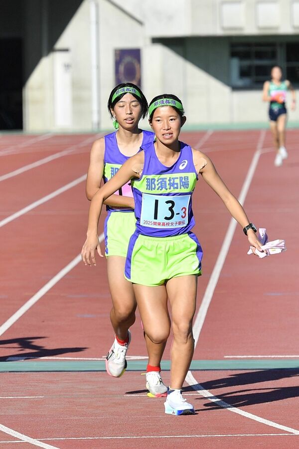 女子那須拓陽の2区塩川からたすきを受けた3区福山が走り出す=埼玉県熊谷市の熊谷スポーツ文化公園陸上競技場