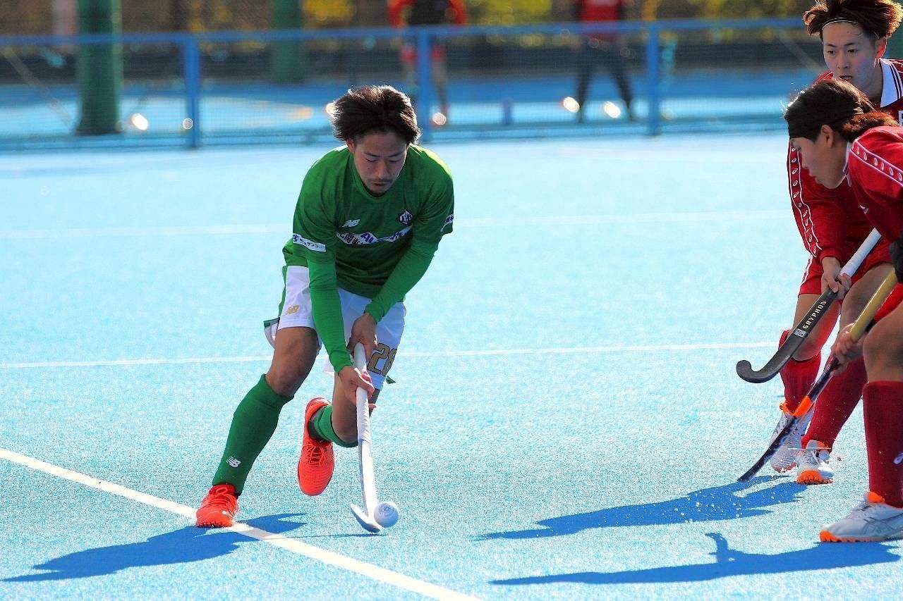 リーベのMF星がボールを運ぶ=大井ホッケー競技場