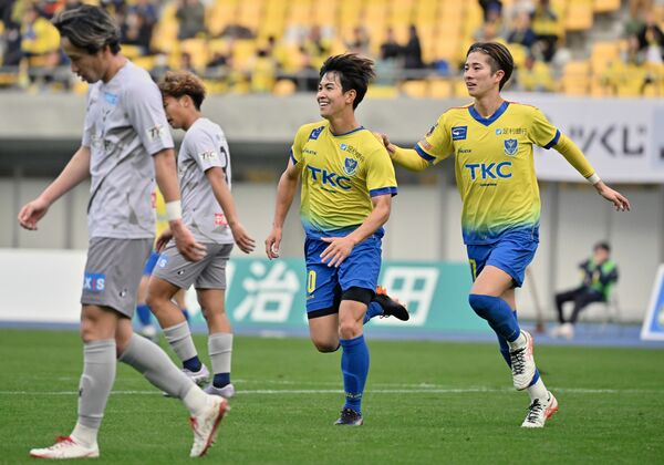 シュートを決め喜ぶバスケス=10月25日の八戸戦