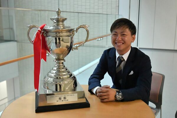 年間優勝を福田知事(右)に報告する海老原=県庁