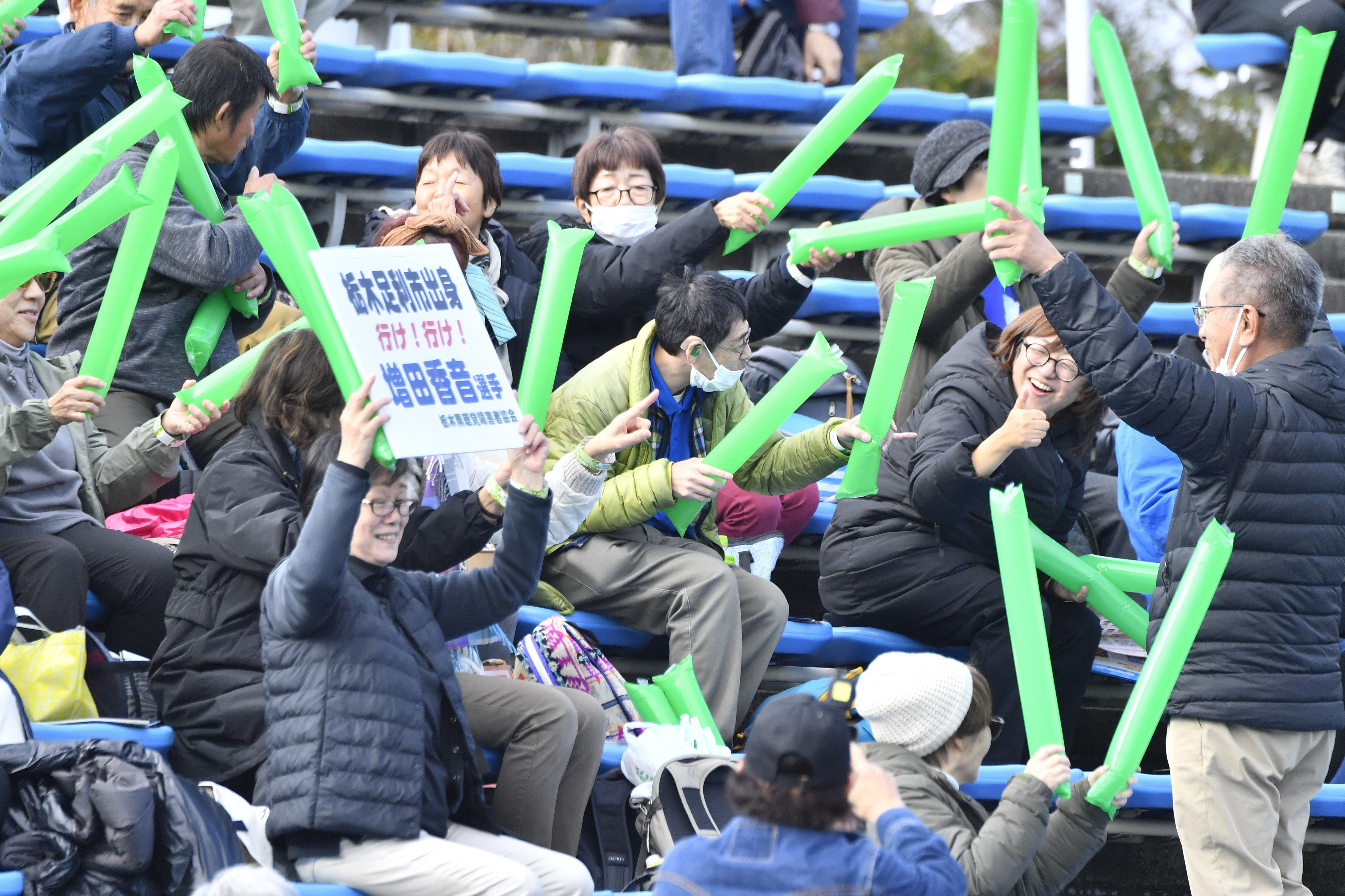 スティックやボードを持って応援する県聴覚障害者協会関係者=Jヴィレッジスタジアム