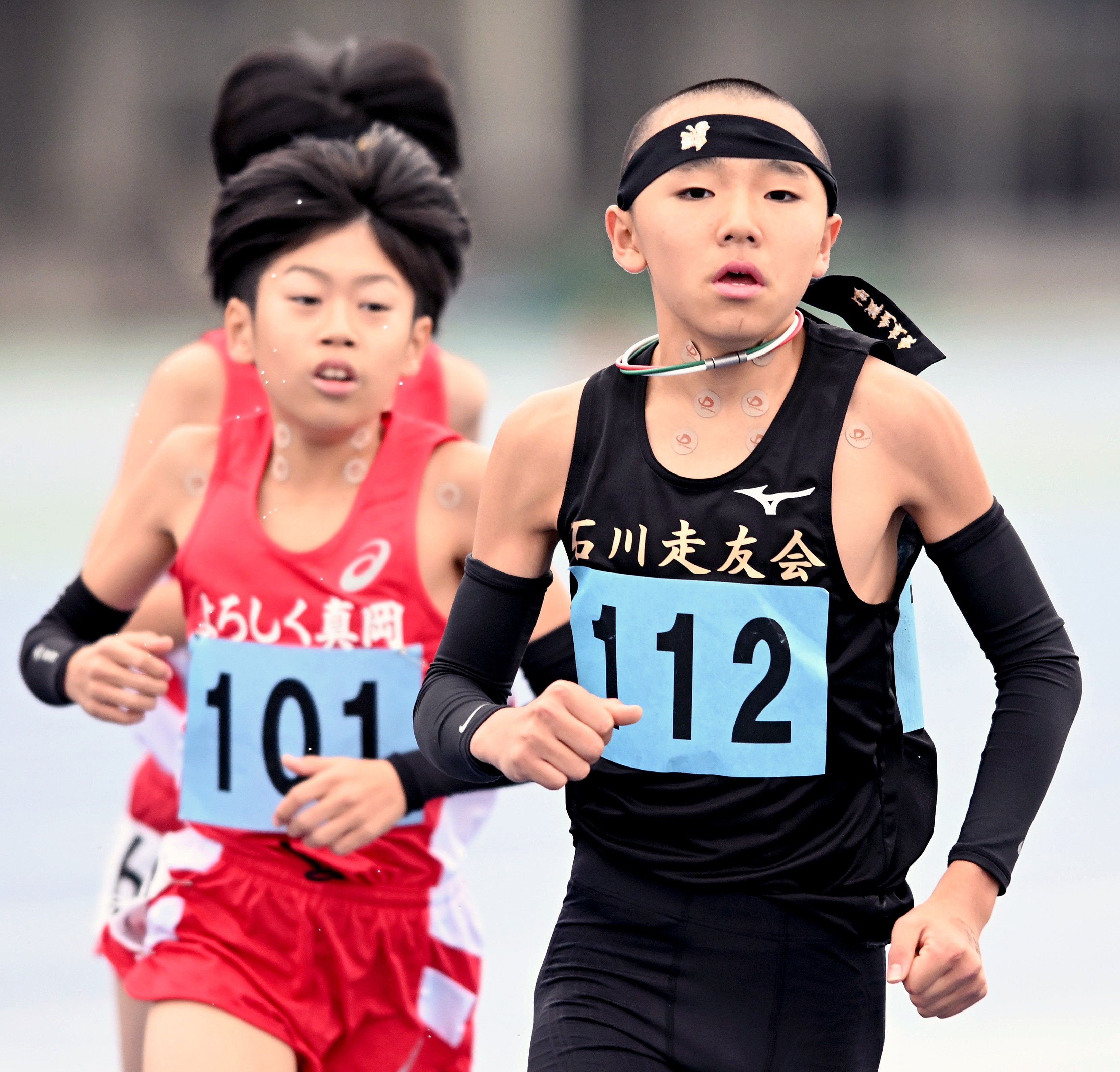 男子1000メートル 2分51秒13の大会新で優勝した新井(石川走友会、写真右)。同左は大会新で2位の白滝(山前小)=県総合運動公園第2陸上競技場