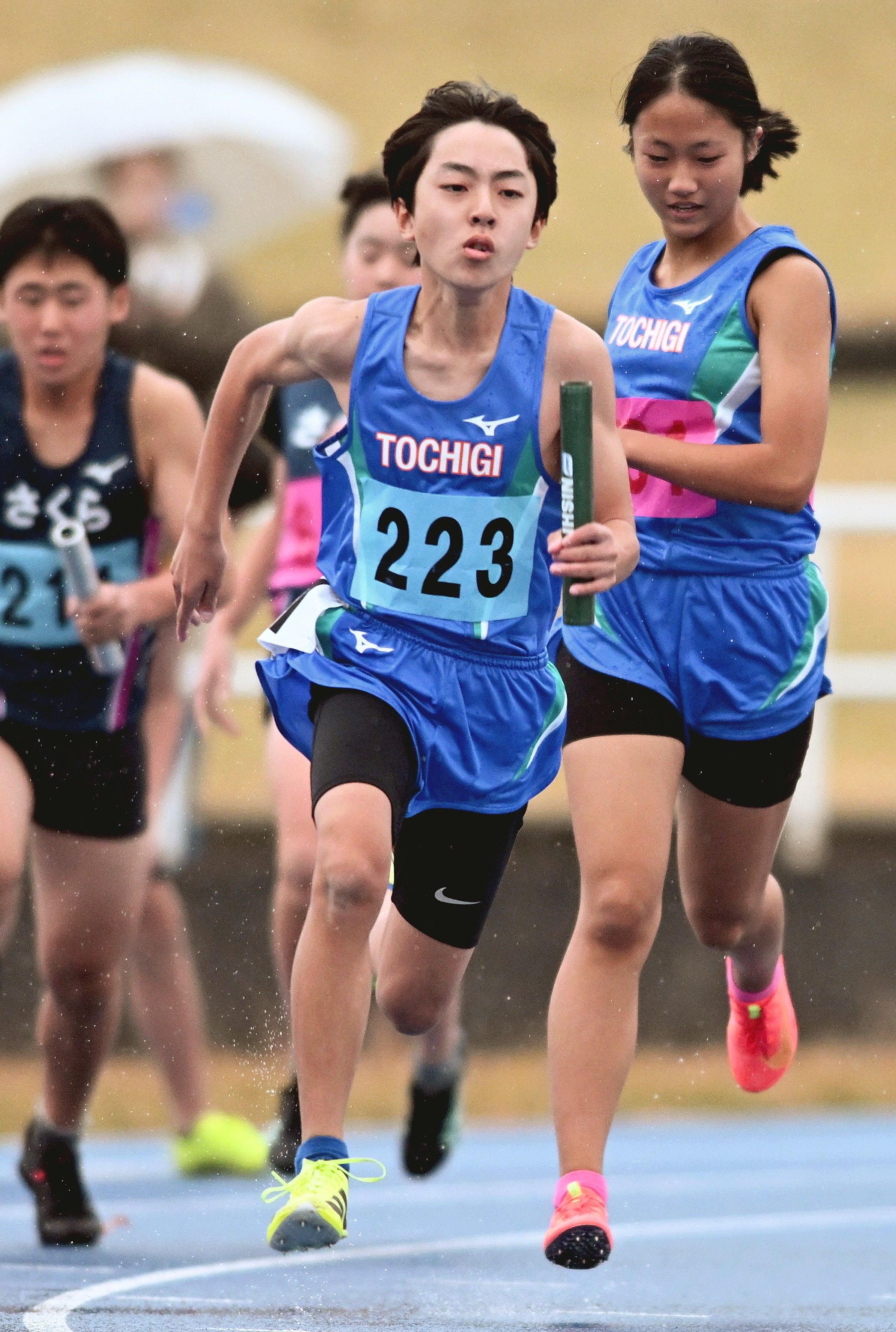 混合400メートルリレー決勝。51秒64で優勝したTOJ。3走・菊地(右)からバトンを受けアンカー・塚原(中央)がスタート