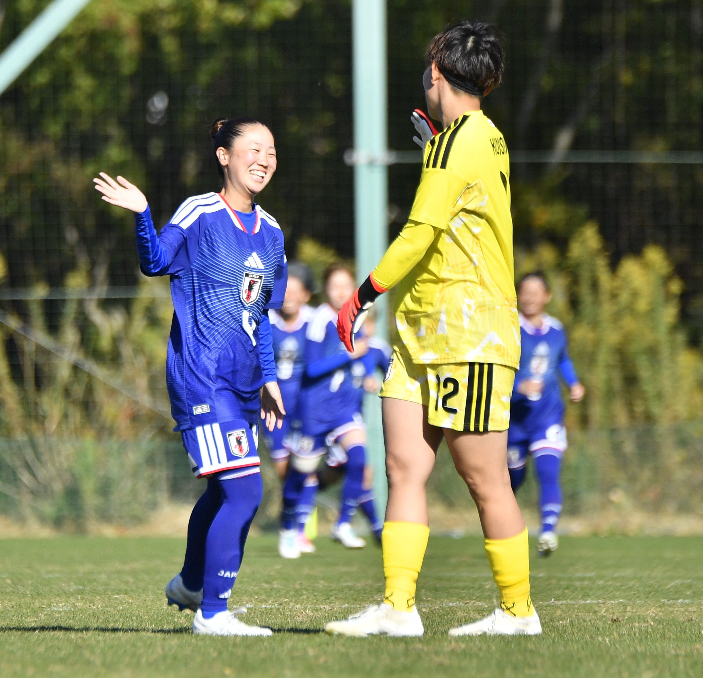 前半17分、日本の先制点が決まりDF増田(左)がGK国島とハイタッチ