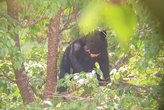 中宮祠小中の敷地にある木に登るクマ=24日午前(同校提供)