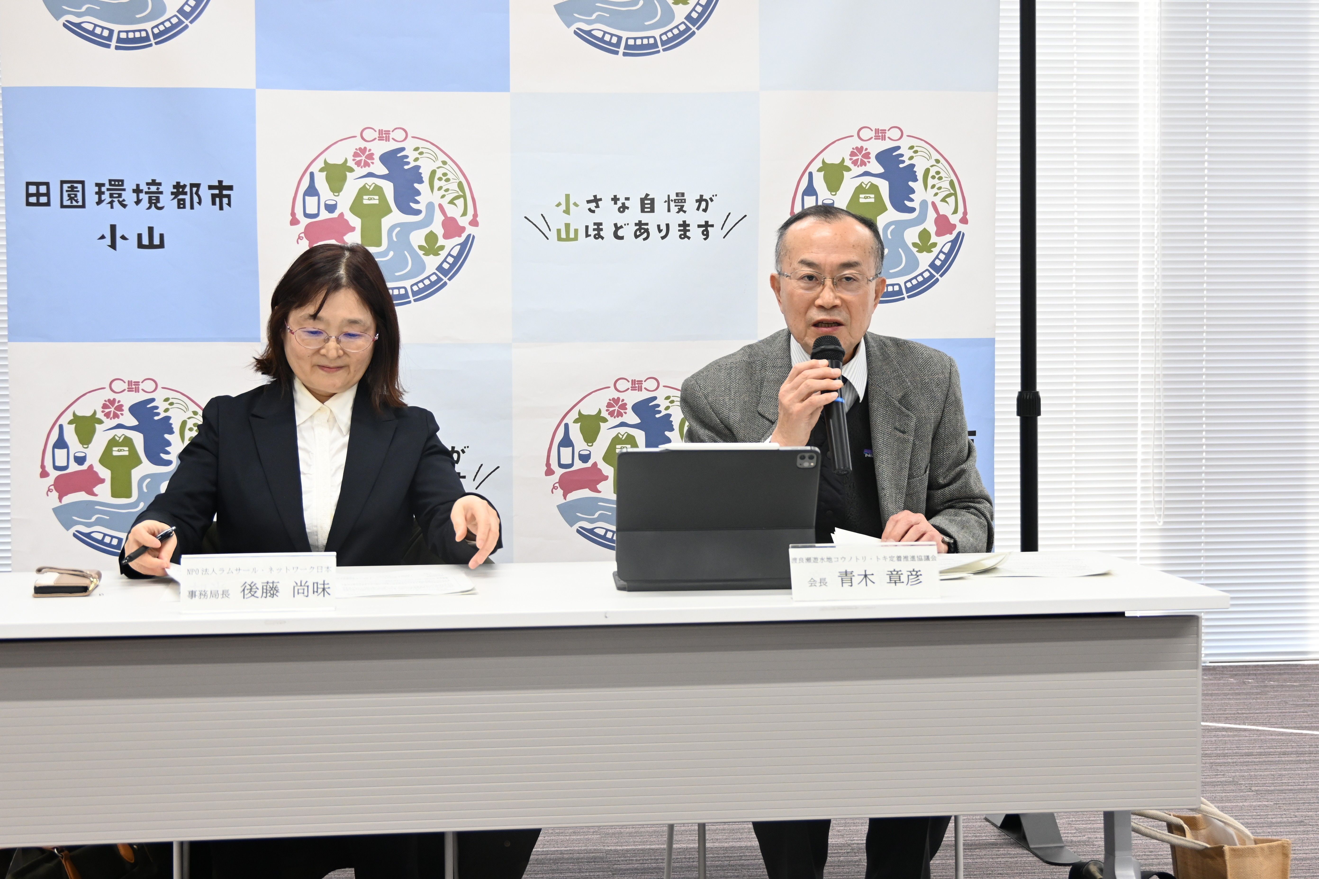 グーグール関連会社による支援の継続を発表する青木会長(右)ら