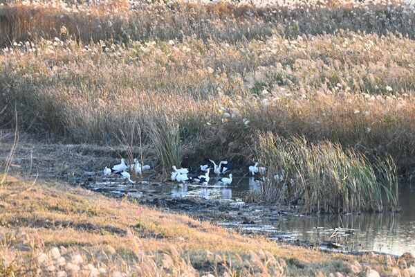 湿地をメンテナンスした効果で昨年11月、渡良瀬遊水地に集結したコウノトリ