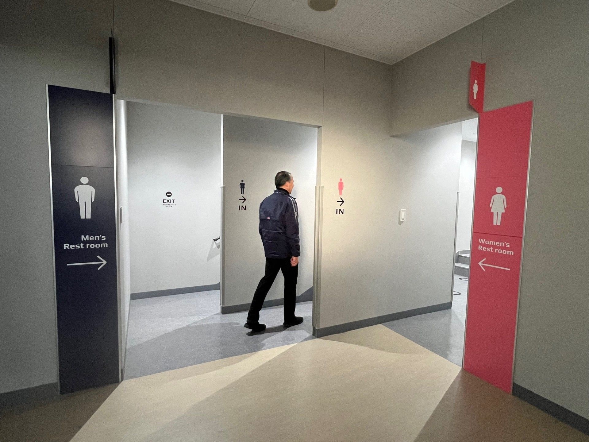 2階に整備された男女のトイレ。入り口「IN」と出口「EXIT」で動線が分けられている
