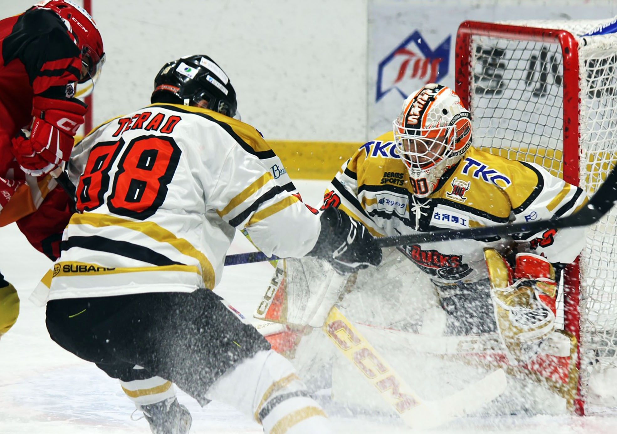 第1ピリオド、バックスのGK大塚(右)らが懸命に守る=北海道苫小牧市のnepiaアイスアリーナ