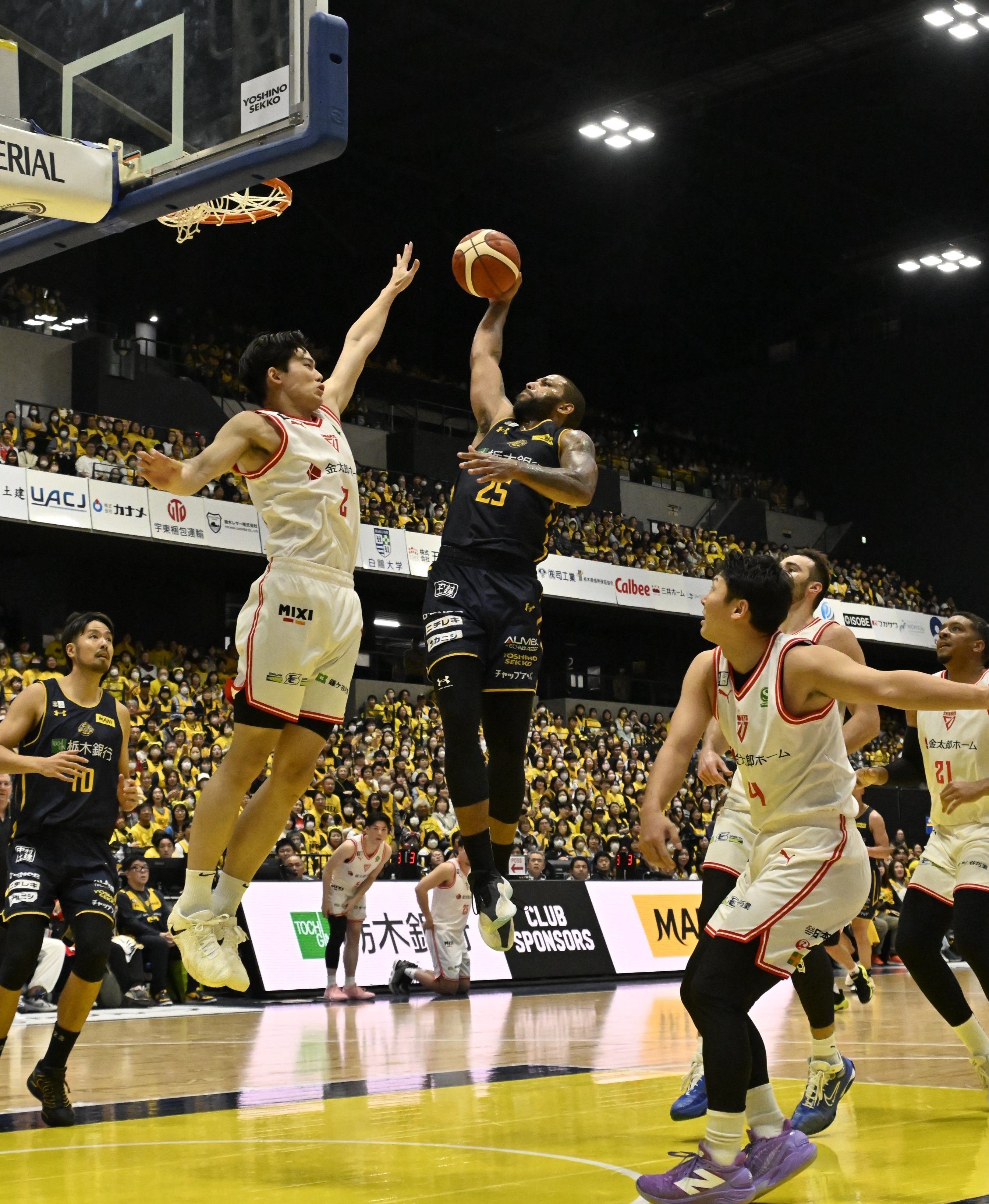 第1クオーター5分、ブレックスのニュービルがファウルを受けながらシュートを決める=日環アリーナ栃木