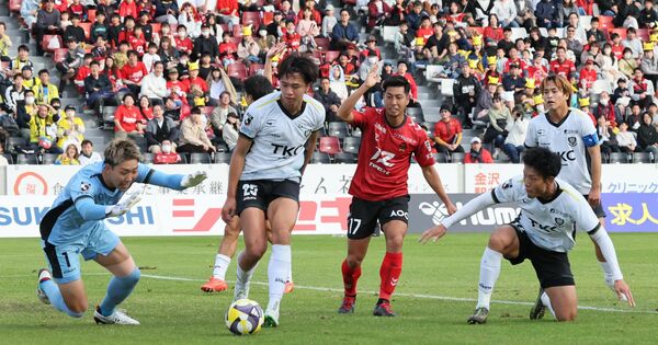 前半、ゴール前で必死に守備をする栃木SCのGK川田(左)ら=金沢ゴーゴーカレースタジアム