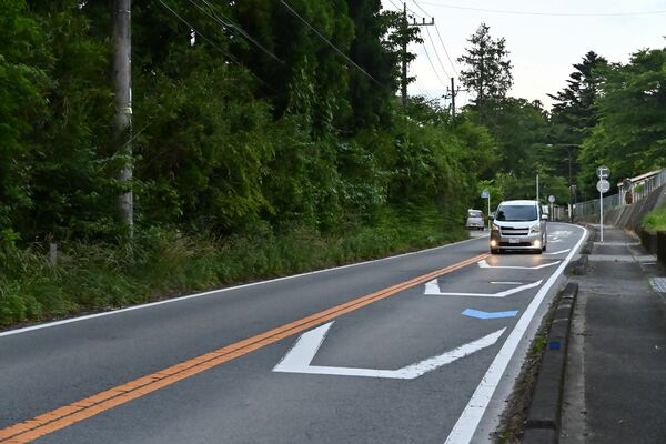 乗用車とクマの接触事故があった現場付近=16日午後6時45分、那須塩原市関谷