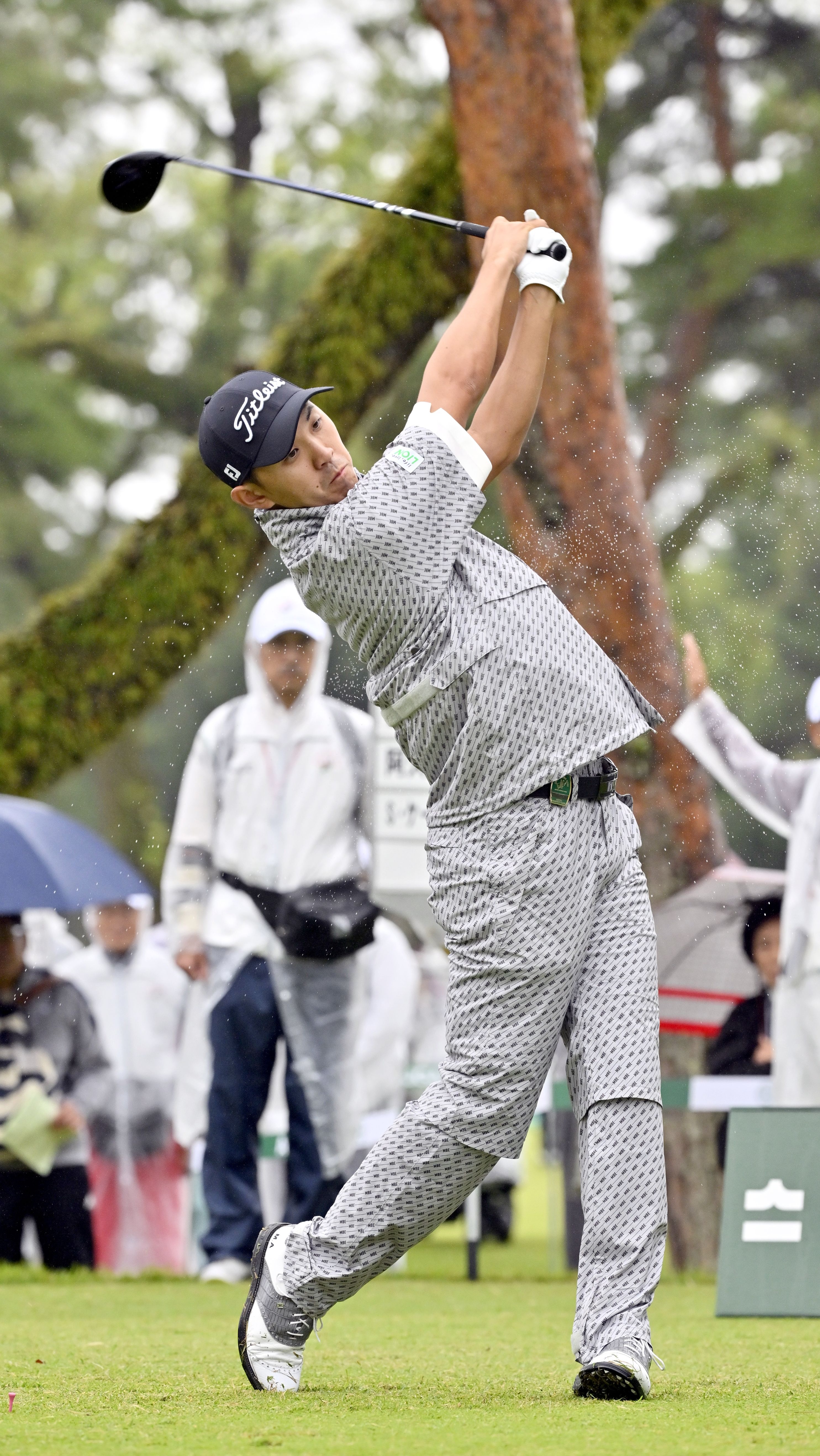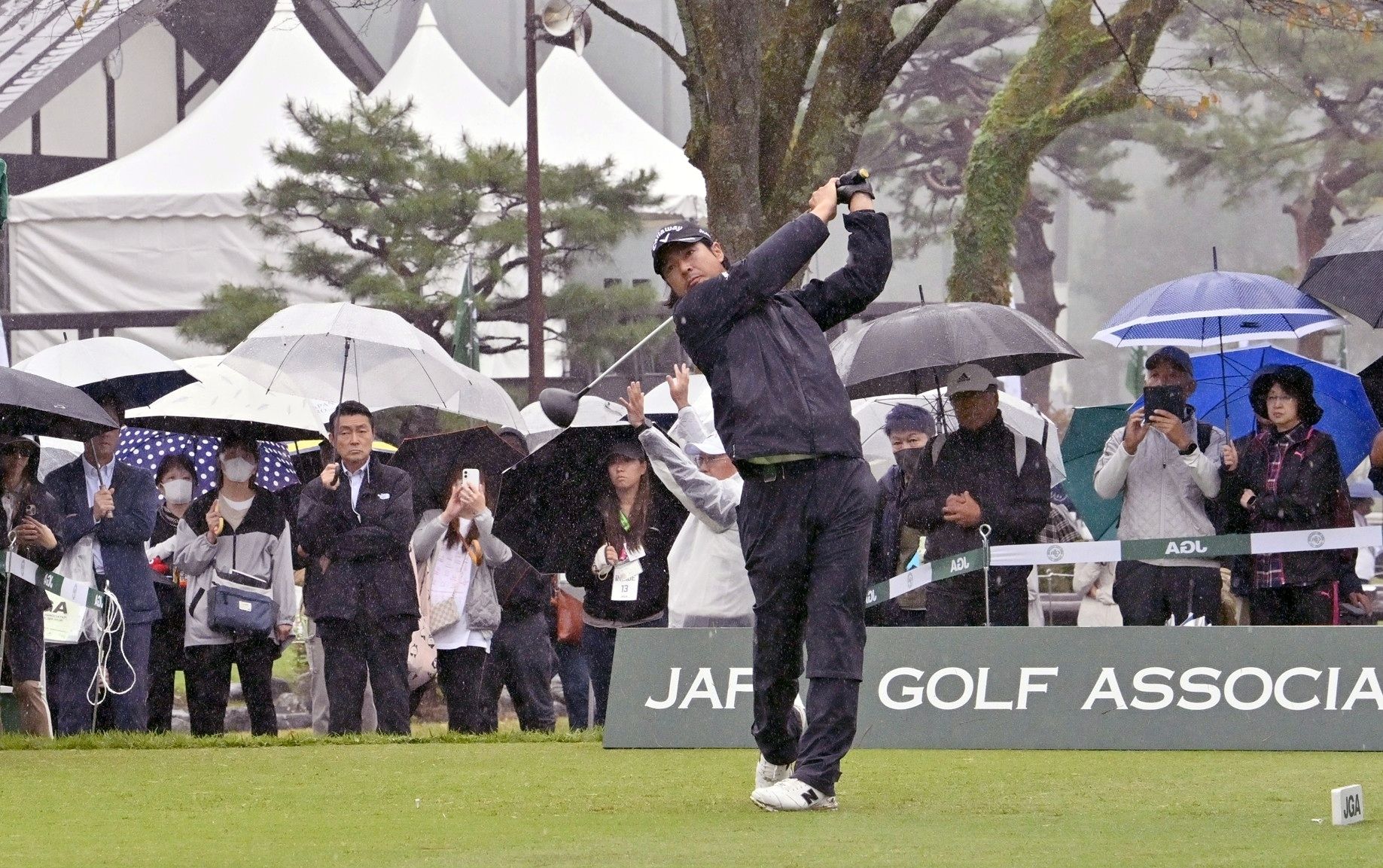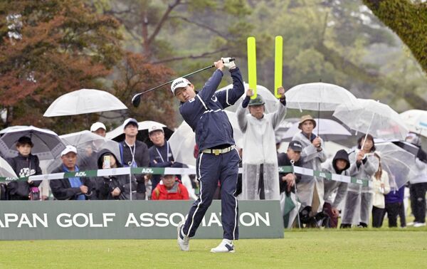 雨の中集まった多くの観衆を前に、ティーショットを放つ前回王者の今平周吾=16日午後0時15分、日光市所野、広瀬華撮影