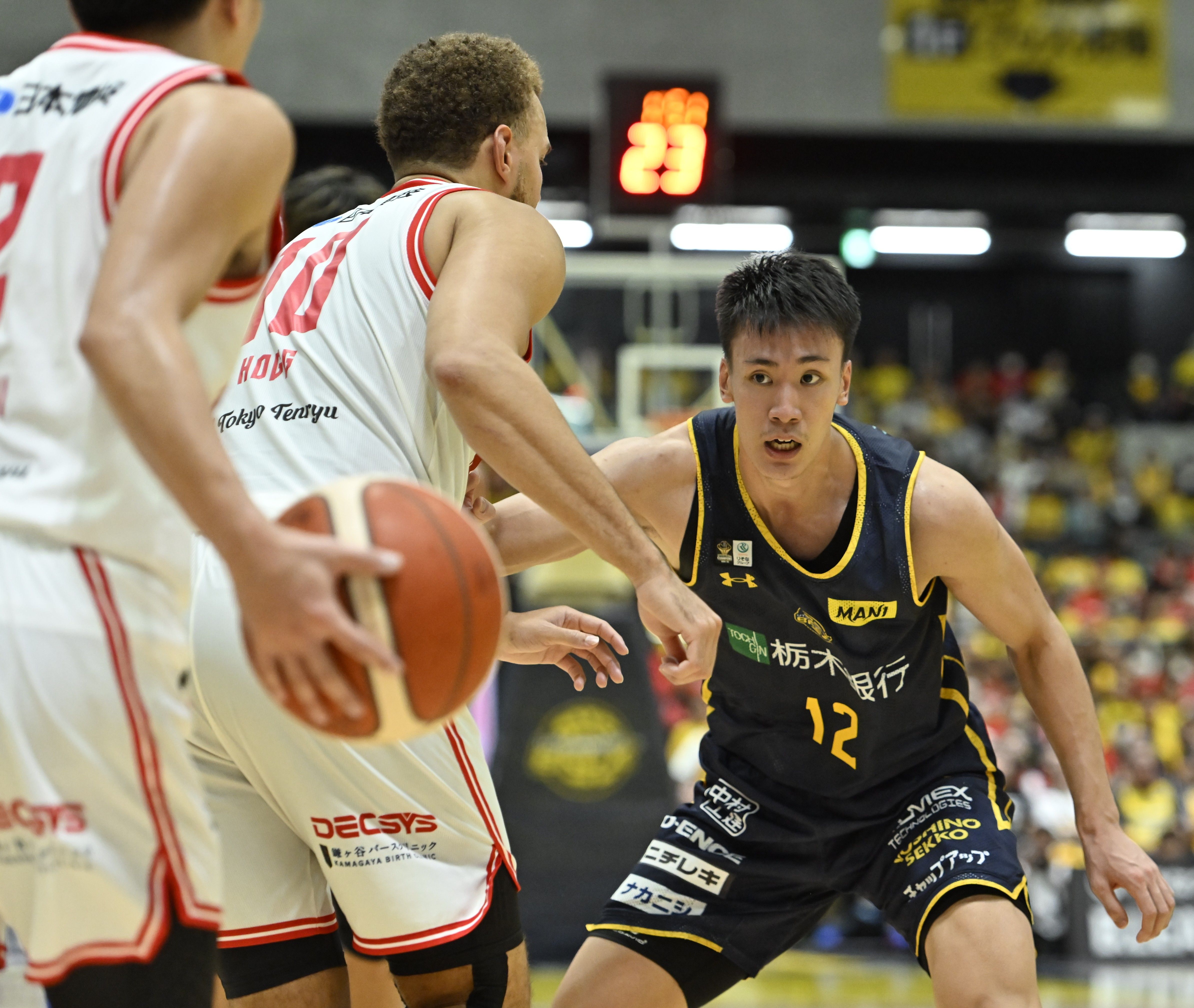 第2クオーター8分、守備に奮闘するブレックスの高島(右)=日環アリーナ栃木