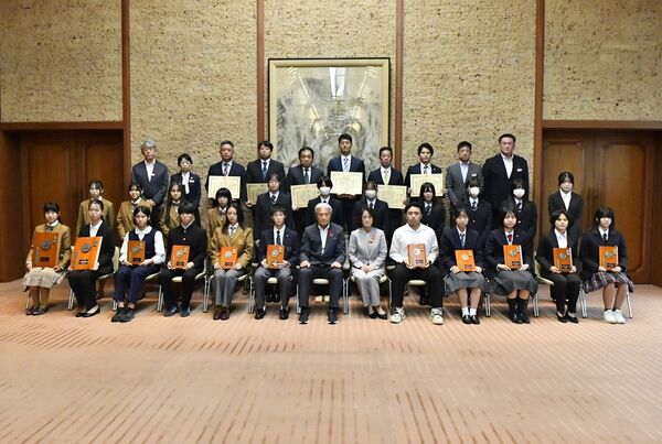 福田知事(前列中央)から表彰を受けた全国大会優勝者たち=県公館