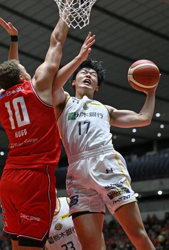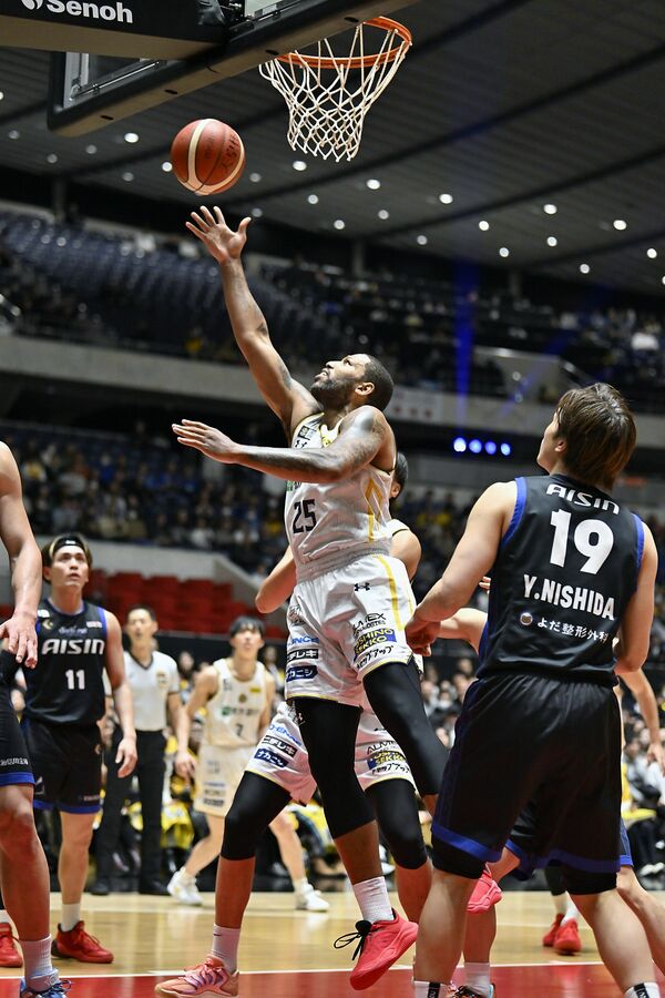 第2クオーター4分、ブレックスのニュービルがシュートを決める=代々木第一体育館、森田大地撮影