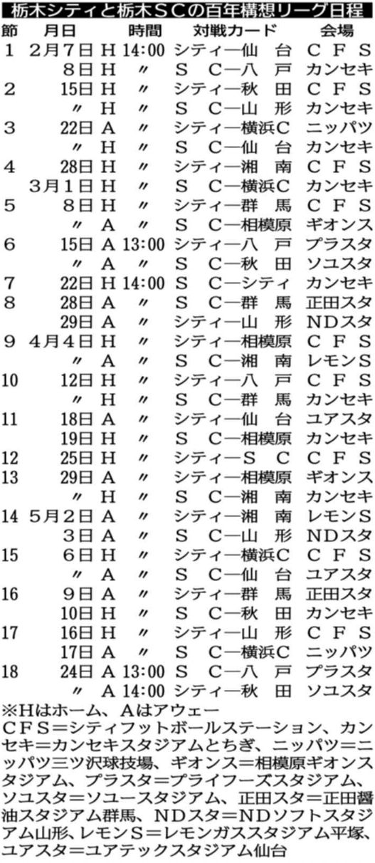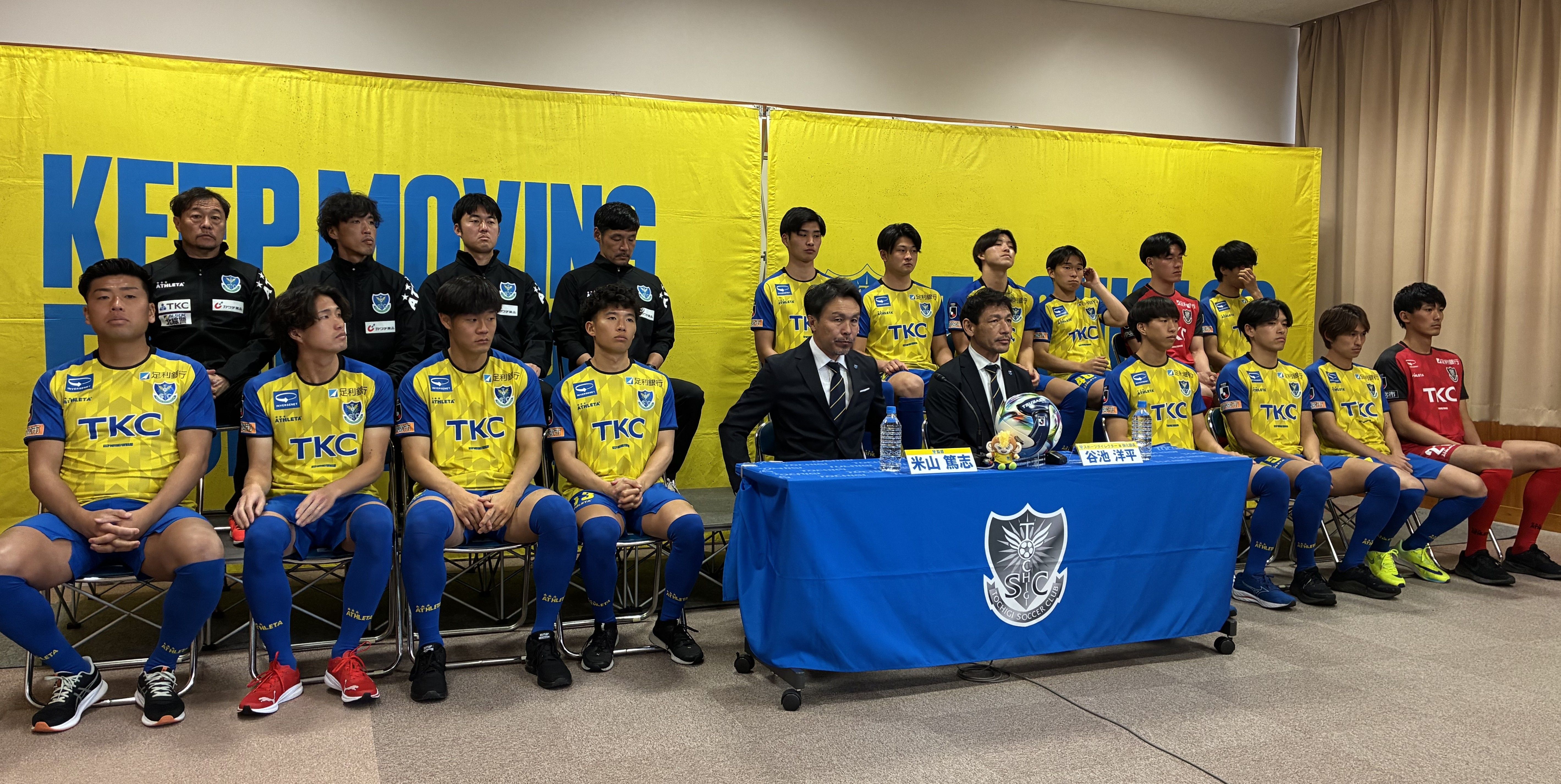今季の活躍を誓う栃木SCの米山監督(中央)と新加入の14選手=さくら市内