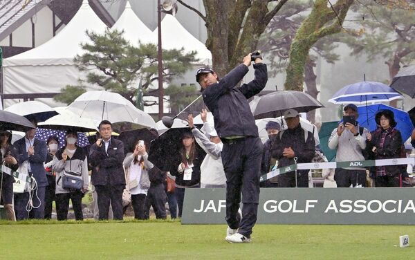 雨の中集まった多くの観衆を前に、ティーショットを放つ石川遼=16日午前10時25分、日光市所野、広瀬華撮影