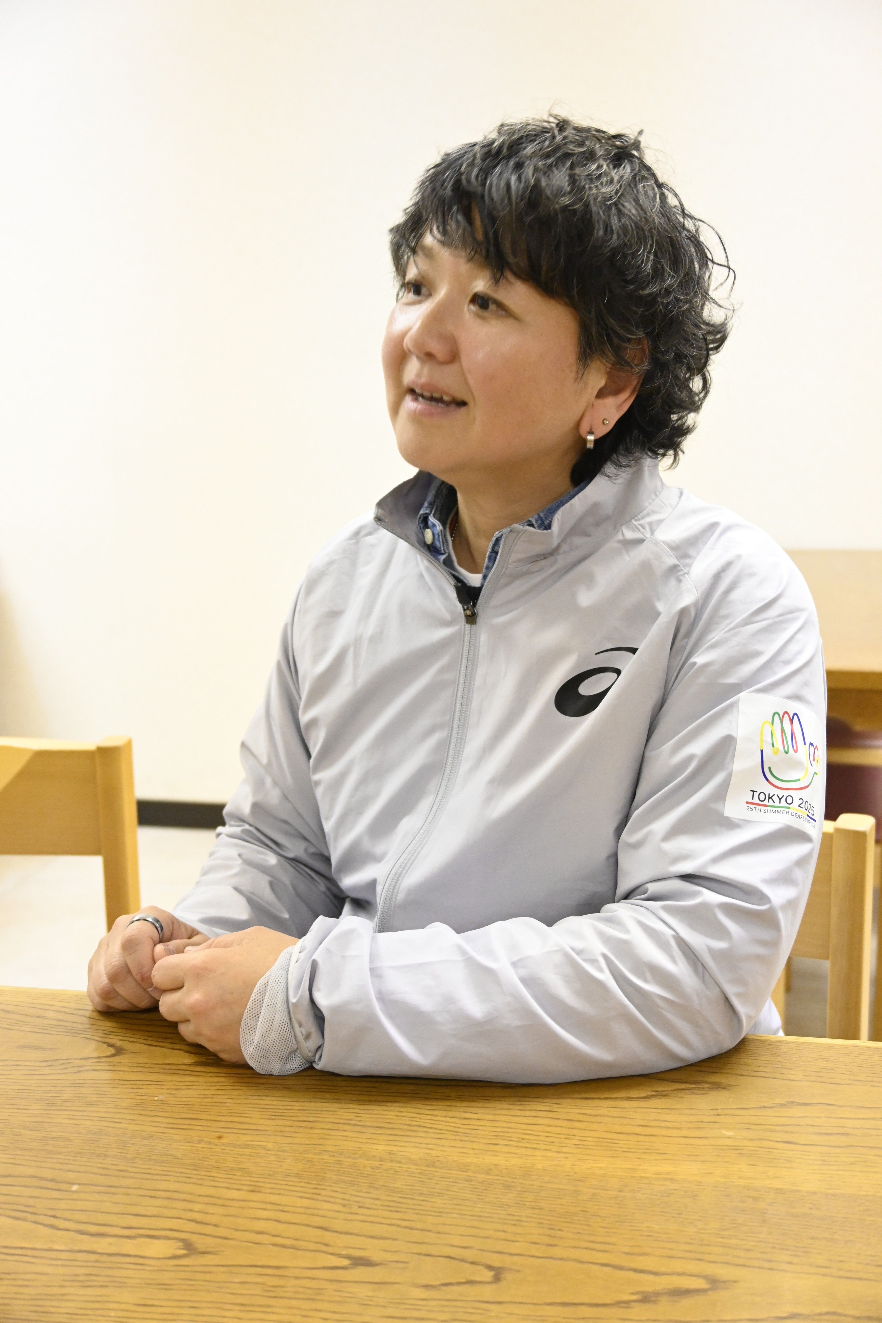 関係者用のウェアを着用して大会を振り返る広瀬さん=12月上旬、東京都新宿区