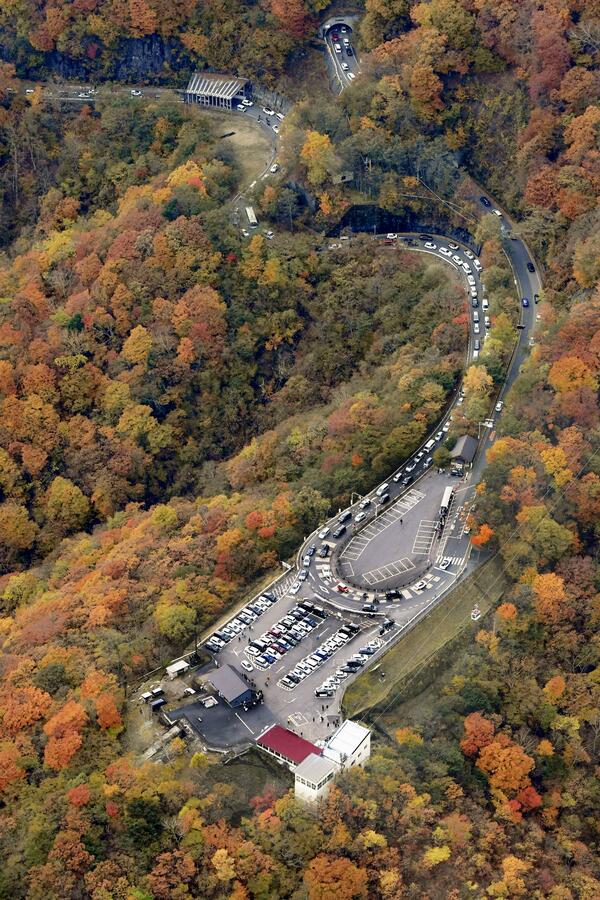 県がいろは坂の渋滞対策として閉鎖した明智平の県営駐車場(手前右)。午前中は一定の効果があったが、午後には激しい渋滞が発生した=2日午後1時19分(共同通信社ヘリから)