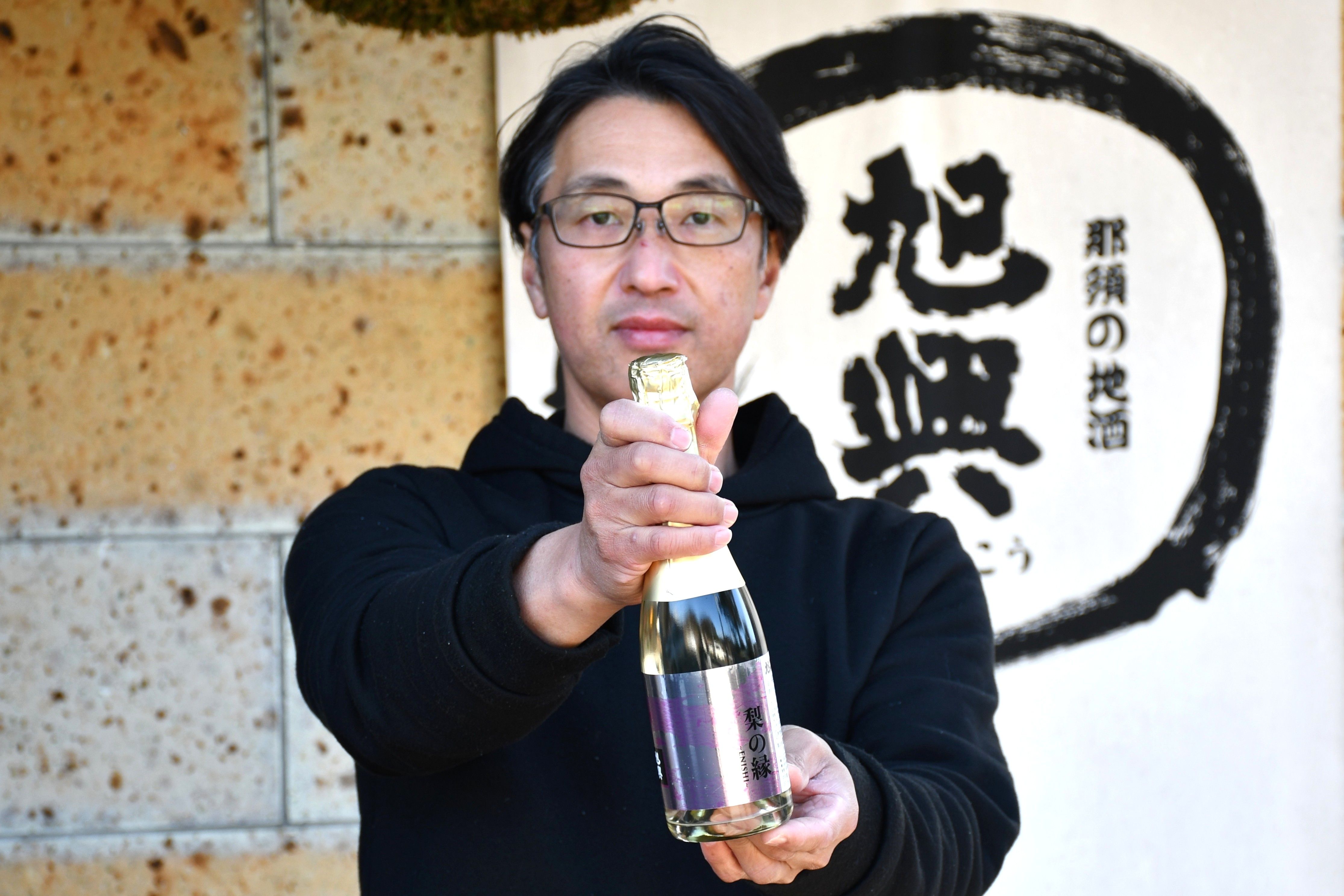 液体充填機のノズルに瓶を差し込み、酒を詰める筆者=2月11日、鹿沼市上粕尾
