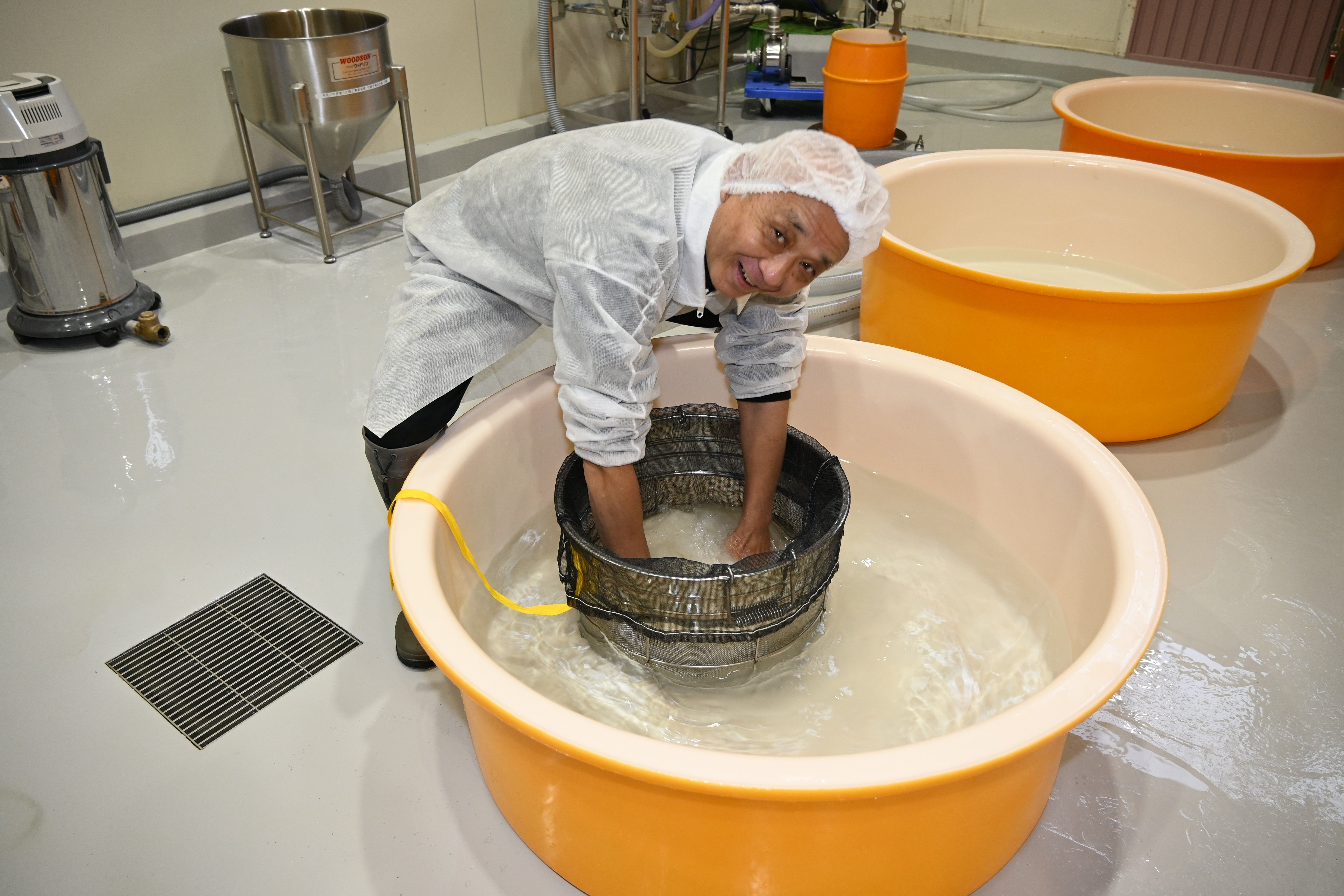 極寒の中、素手で7キログラムの掛け米を洗米する筆者=1月7日、鹿沼市上粕尾