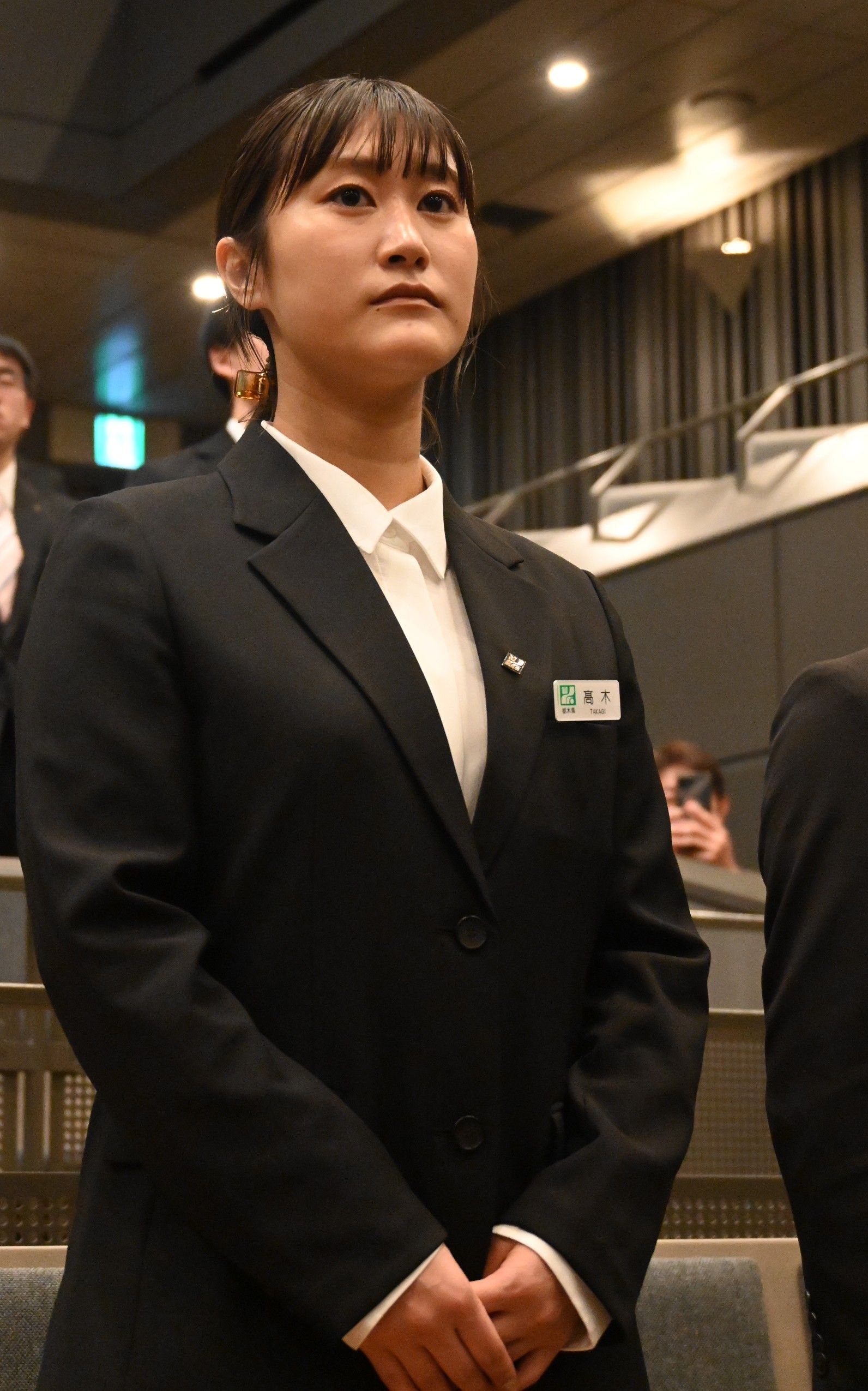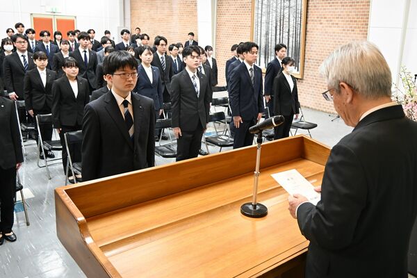 県新採用職員の辞令交付式に臨む高木さん。技術職として県土整備に尽力する思いを新たにした=1日午前、県総合文化センター