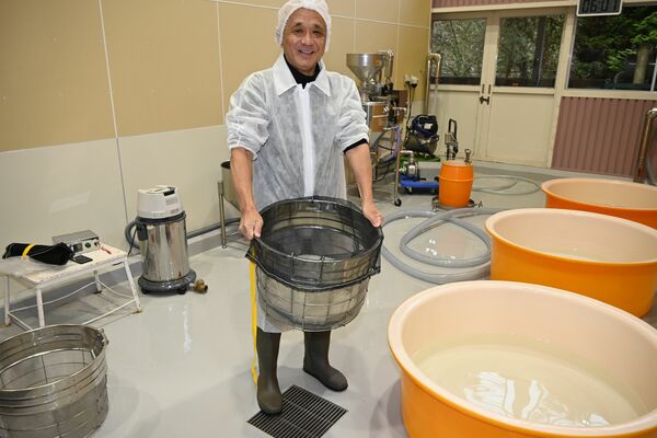 醪タンクに掛け米を入れる留め仕込み作業=1月11日、鹿沼市上粕尾