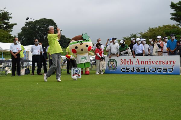 栃木県民ゴルフ場30周年を記念し試打セレモニーを行う福田知事=2022年8月