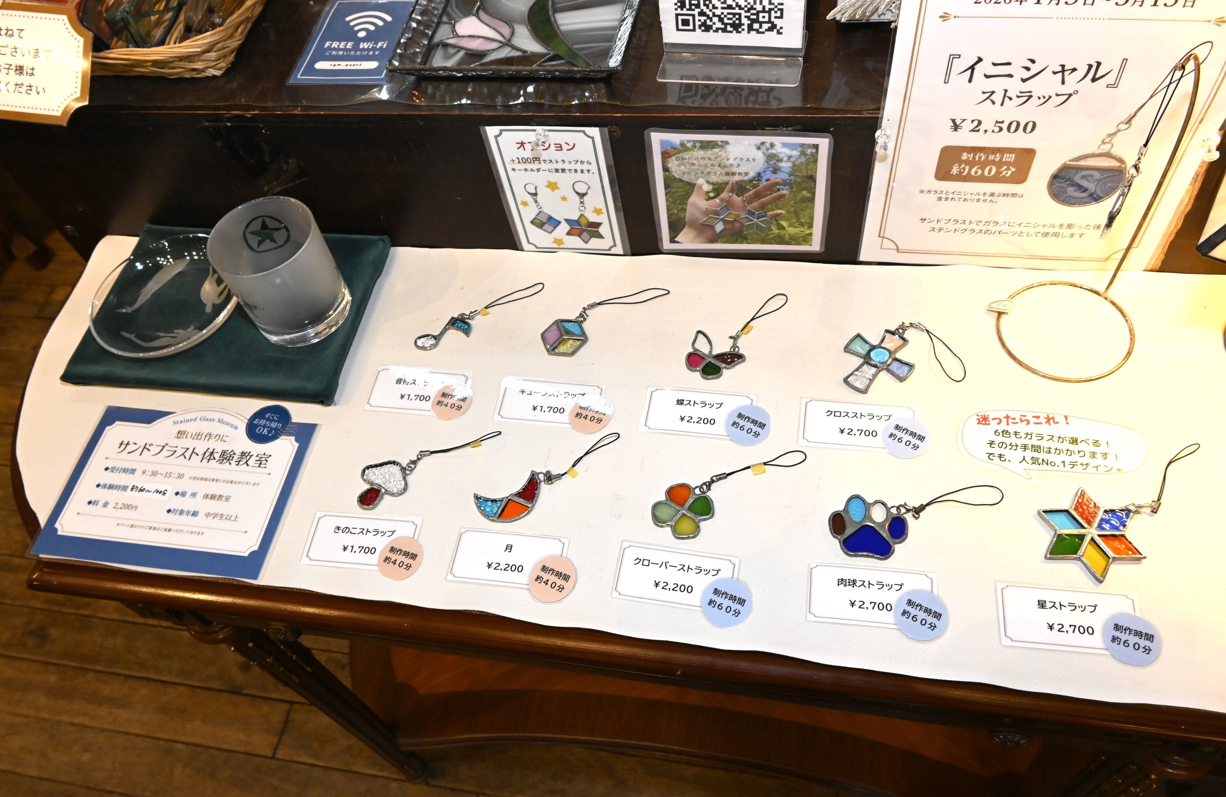 制作できるステンドグラスのストラップや食器の作品例