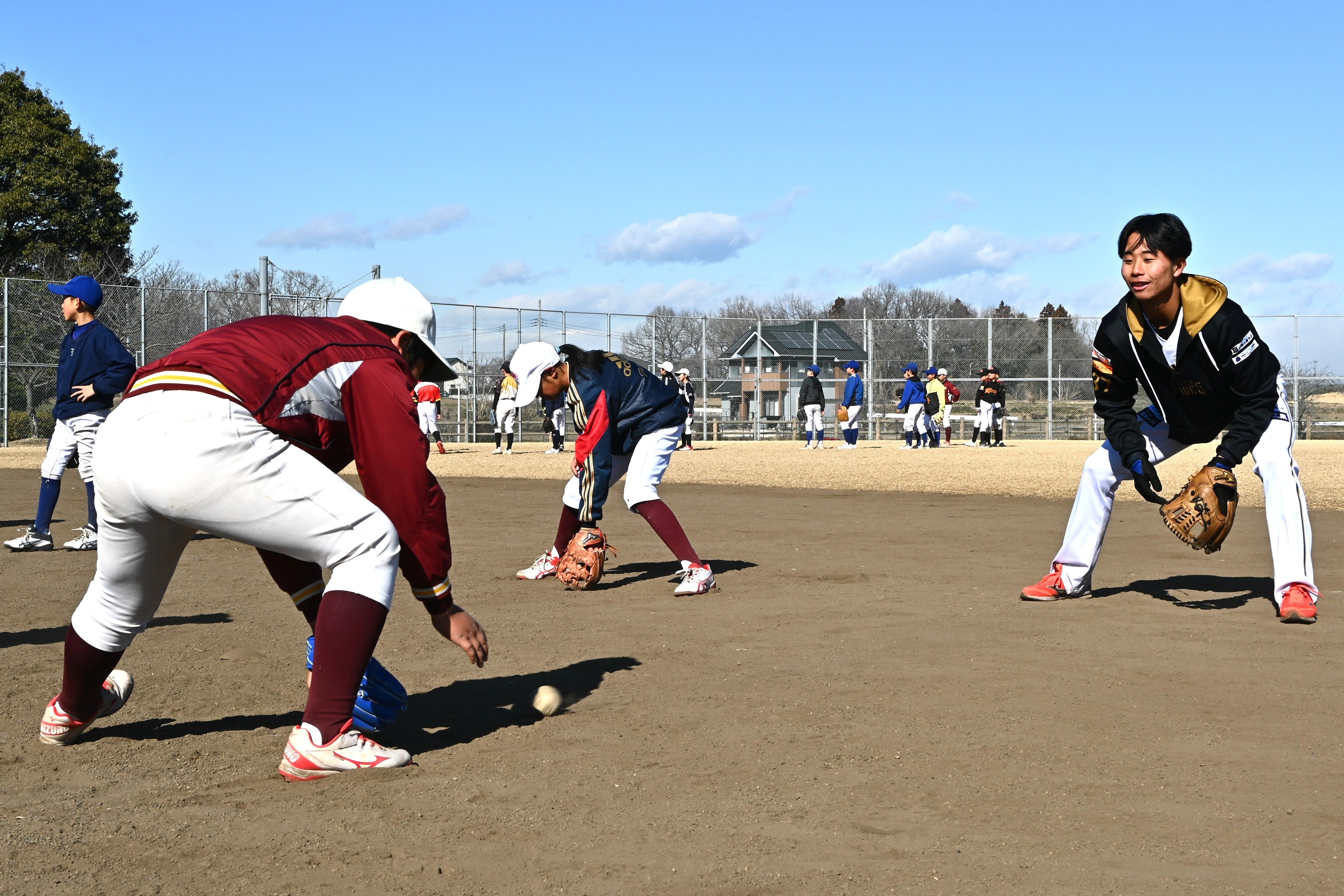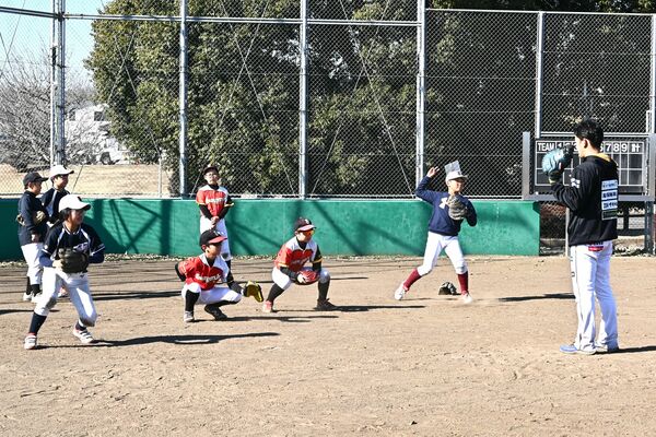 選手に教わりながら野球の練習をする子どもたち