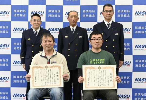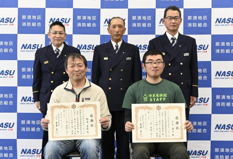 感謝状を贈られた野本芳彰さん(前列左)と小玉さん(同右)