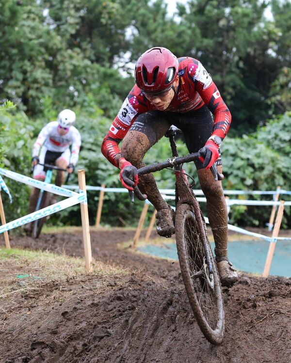 ブリッツェンの沢田が泥の坂を勢いよく下る=千葉市の幕張海浜公園特設コース