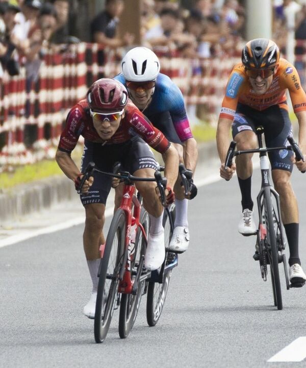 ゴールスプリントで後続を突き放すブリッツェンの岡=沖縄県名護市