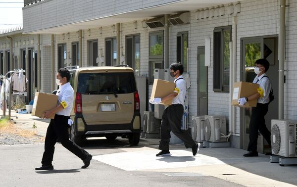 施設から資料を運び出す栃木労働局の職員=2023年8月31日午後0時5分、真岡市東郷(画像は一部加工しています)