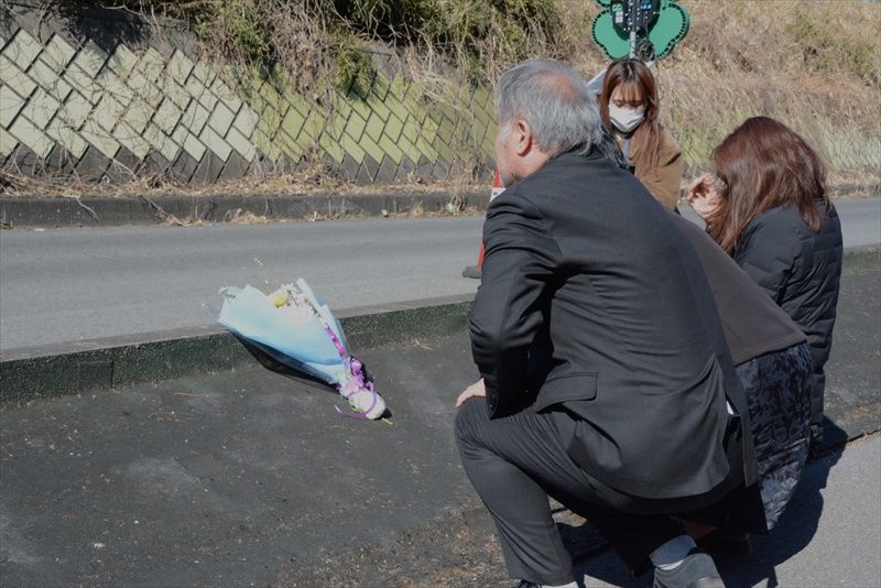 事故現場近くを訪れた多恵子さん(右端)と献花した井上さん(左端)ら=12日午後、宇都宮市下栗町